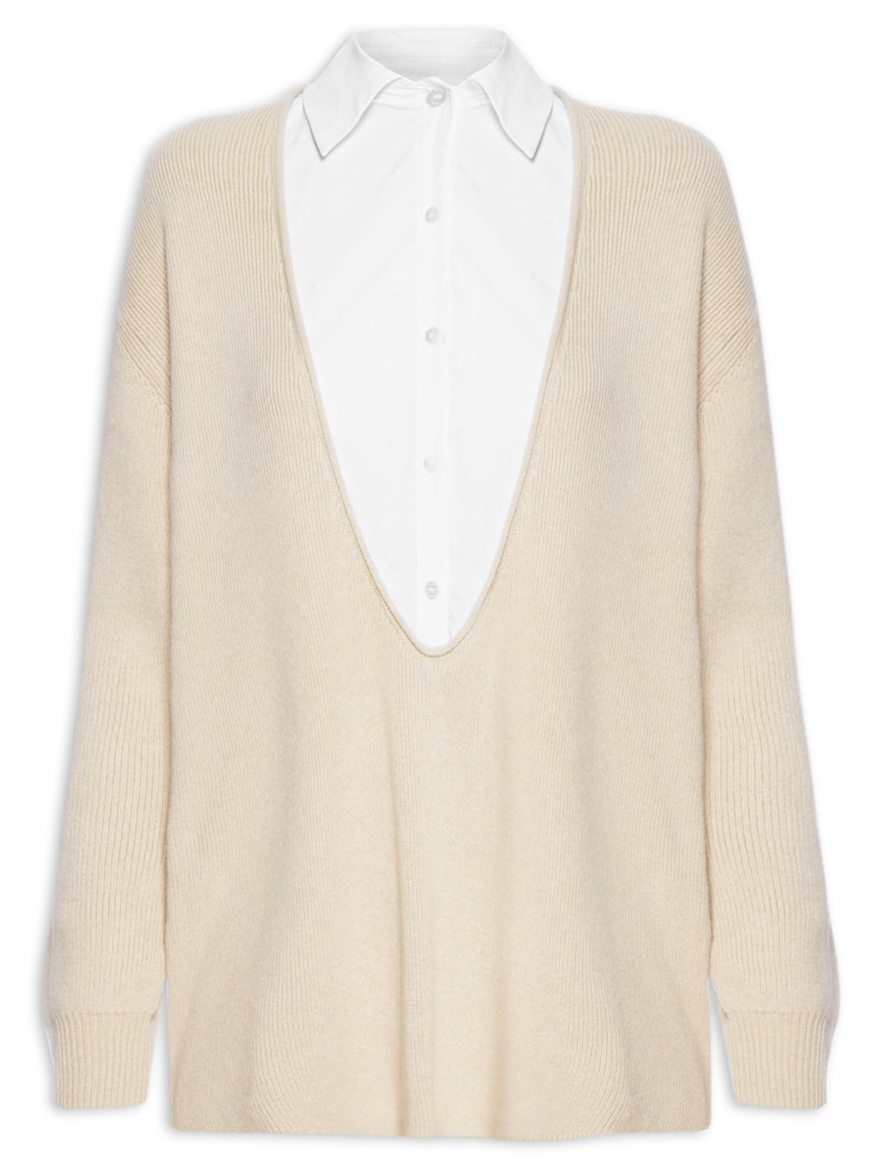o Suéter Bege é Confeccionado Em tricot Com Alta Elasticidade. A Peça De Modelo Oversized* Solta Ao Corpo Possui Colarinho Simples E Recorte Frontal Em Tecido Leve, Ombros Estendidos, Recorte Posterior, Mangas Longas Com Ajuste Nos Punhos E Fechamento Frontal Por Botões.