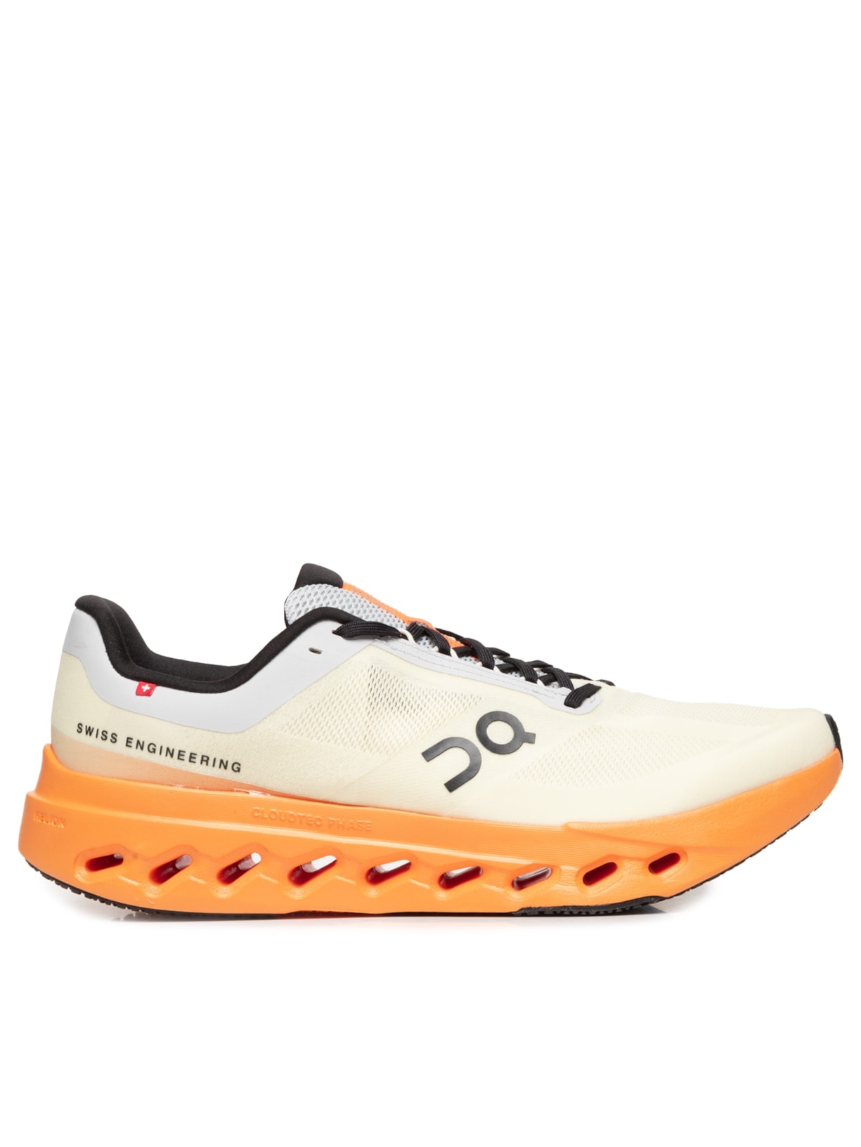 O tênis laranja é produzido em mesh. A peça possui bico arredondado, cano baixo acolchoado, palmilha macia com logo da marca aplicado, lingueta com tag da marca aplicada em cor contrastante, recortes laterais em cores contrastantes, logo da marca aplicada nas partes laterais em cores contrastantes, entressola com recortes vazados e escritas em alto e baixo relevo, solado emborrachado e fechamento superior por adarço.