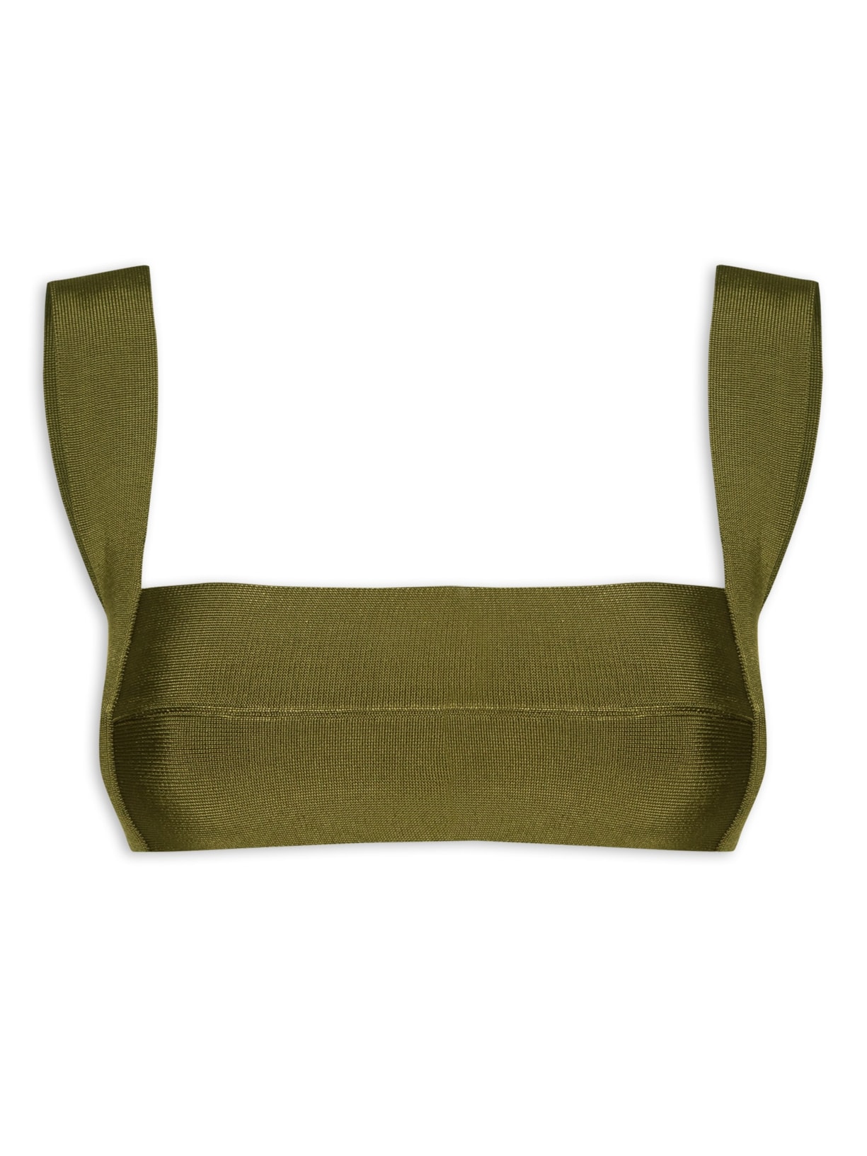 O top verde é confeccionado em tricot de baixa elasticidade. A peça justa ao copro, possui decote reto, alças largas, recortes frontais e posteriores e comprimento cropped*.