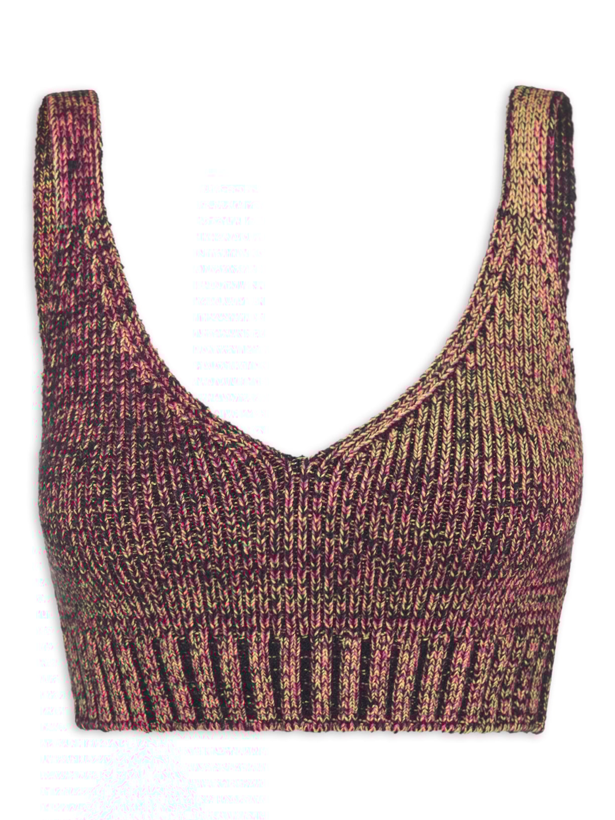 O top rosa é confeccionado em tricot. A peça possui decote V, alças largas, cavas regulares, tag metalizada da marca na parte posterior, comprimento cropped*, shape justo caimento reto e acabamento canelado.