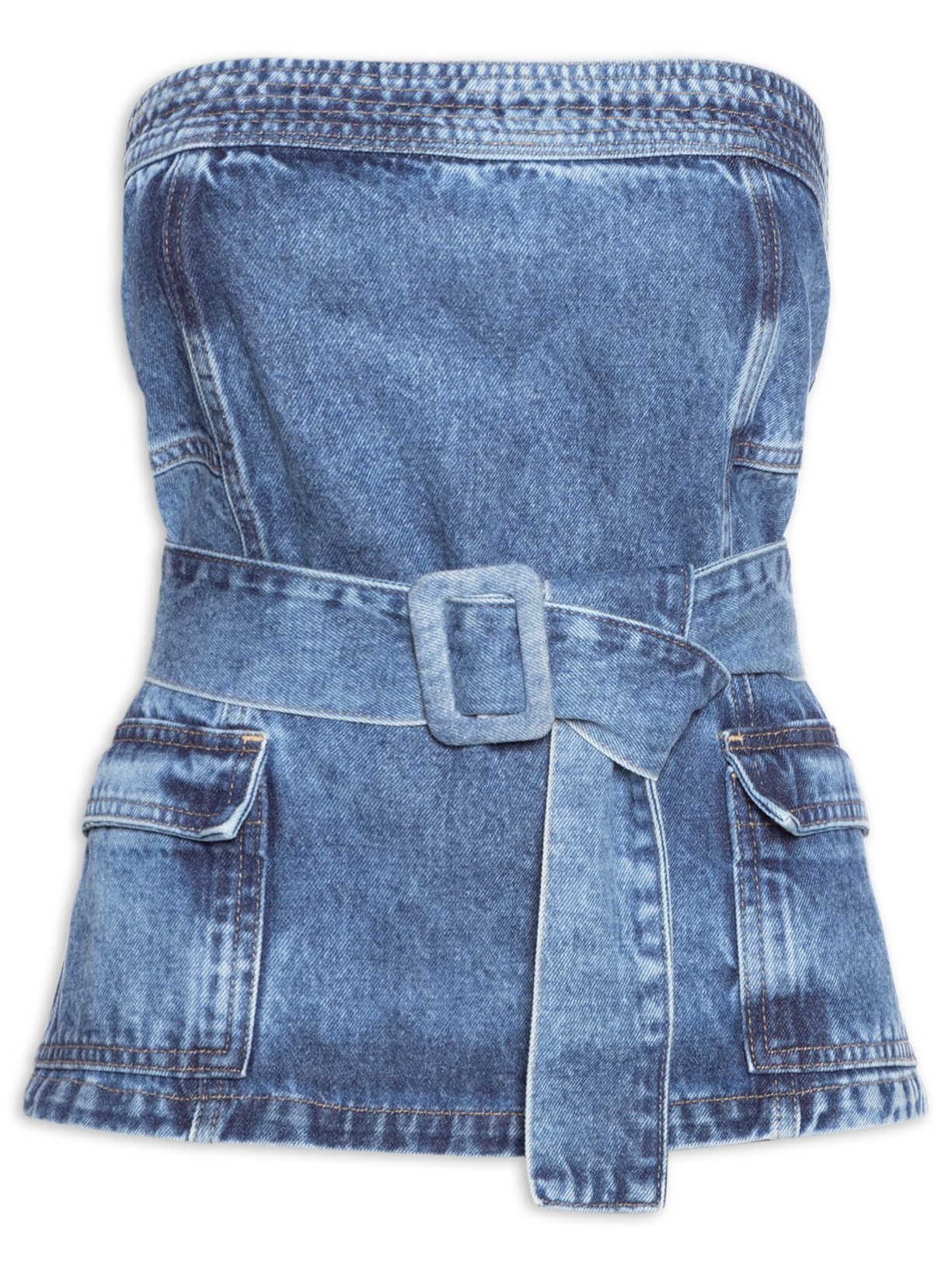 O top azul é confeccionado em sarja com lavagem em jeans sem elasticidade. A peça de modelo tomara que caia justa ao corpo possui decote reto, recortes posteriores e frontais, fenda posterior, efeito estonado, bolsos frontais com aba sobreposta e fechamento posterior por zíper. Acompanha cinto no mesmo tecido e cor com espessura média para uso opcional.