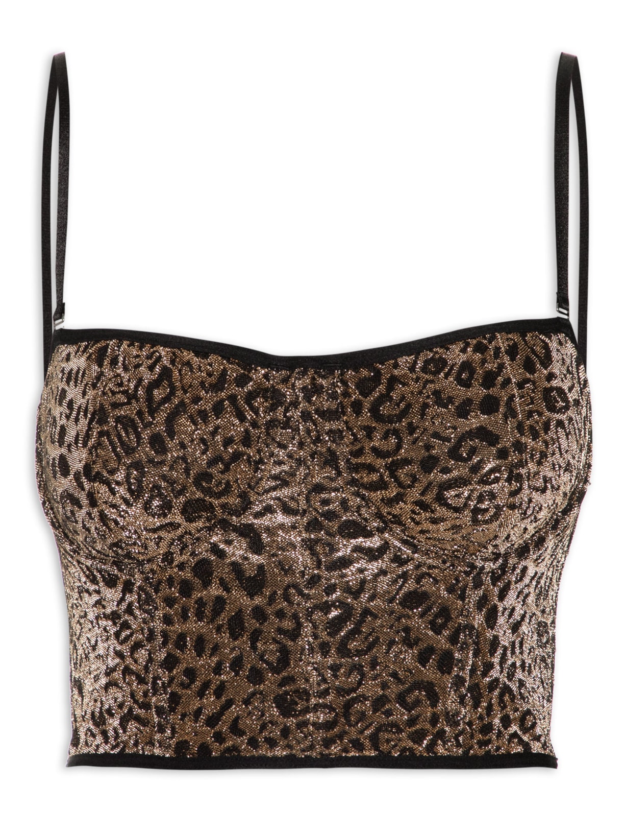 O top animal print é confeccionado em tule com fios de lurex. A peça possui decote coração, alças finas reguláveis e removíveis, aro para sustentação e barbatanas embutidas, forro, comprimento cropped*, shape justo, caimento reto, acabamento pespontado e fechamento posterior por zíper.
