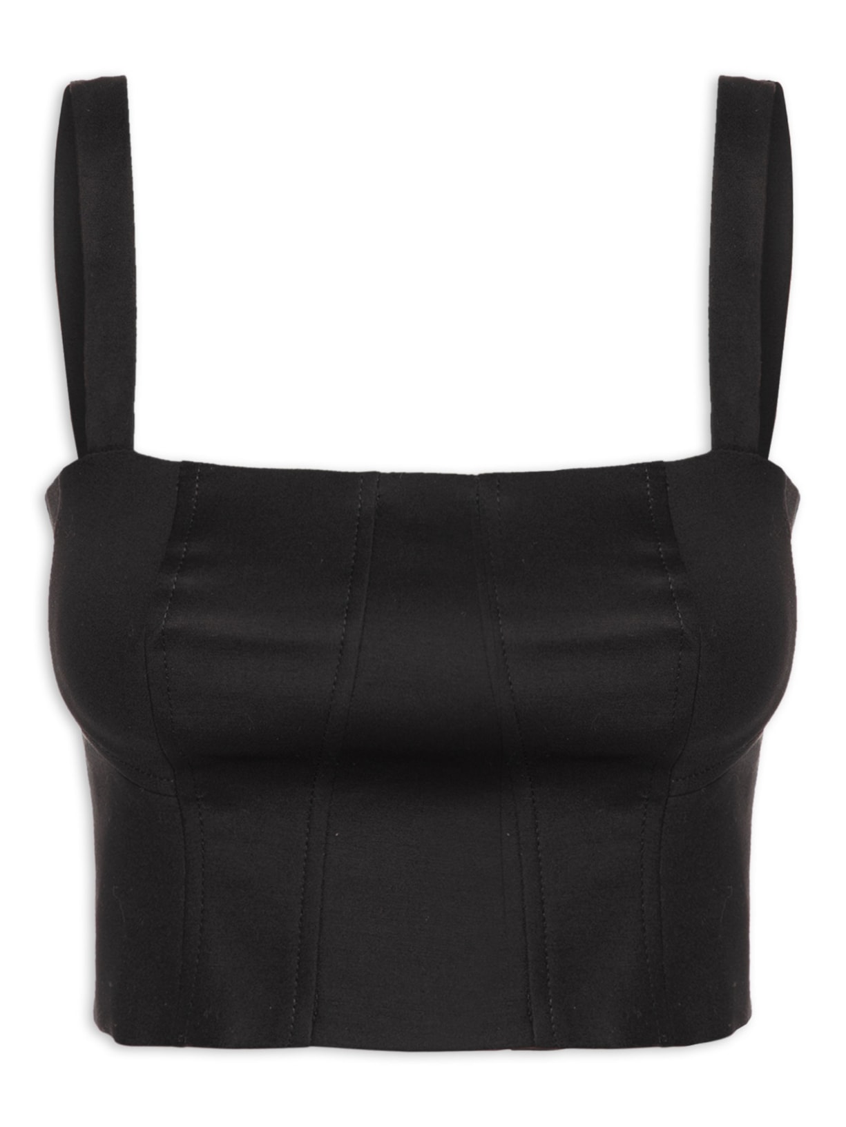 O top preto é confeccionado em tecido leve de algodão. A peça possui decote reto, alças finas, recortes frontais, comprimento cropped, acabamento pespontado e fechamento posterior por zíper metalizado.