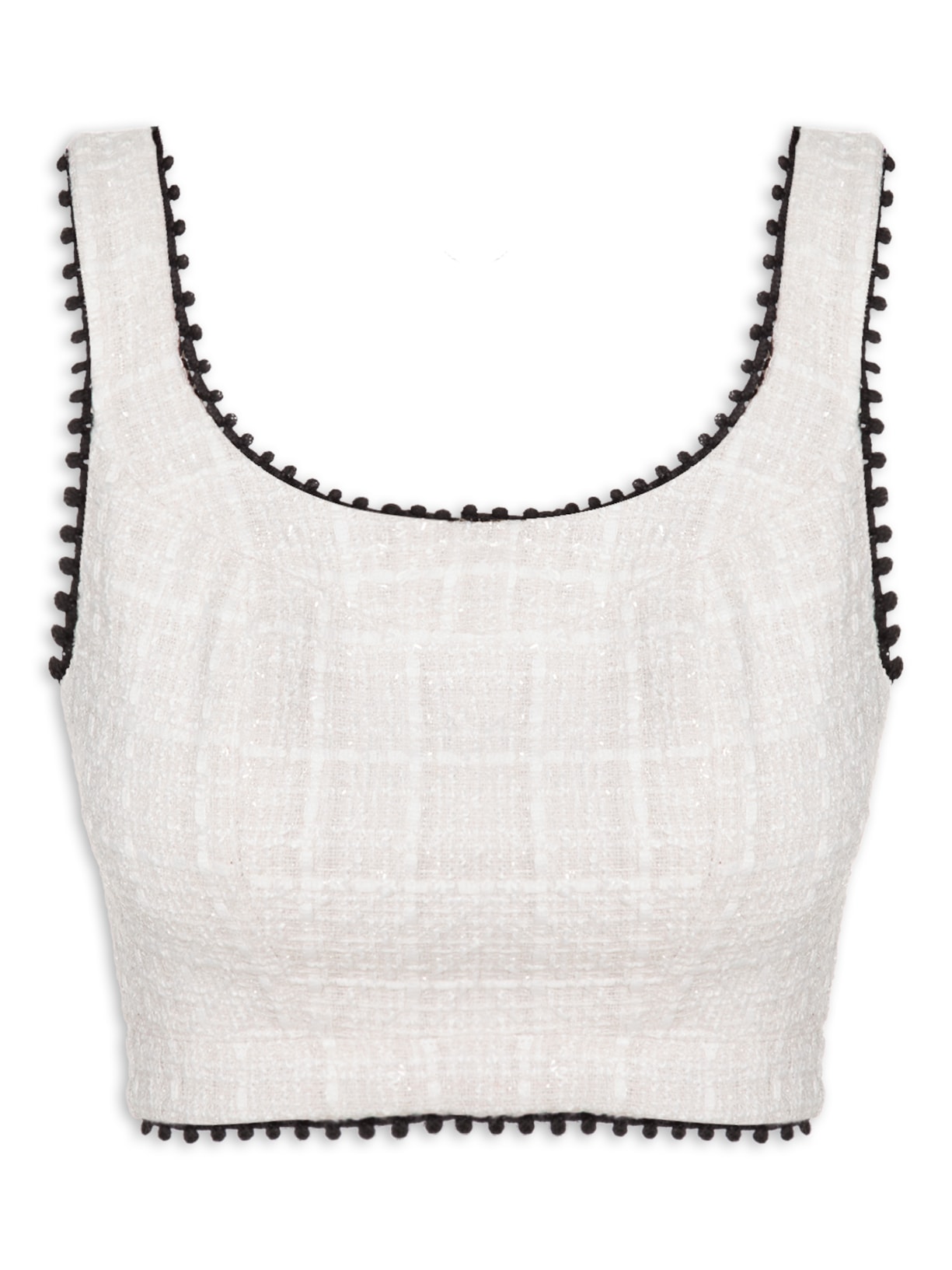 O top off white é confeccionado em tweed com fios de lurex. A peça possui decote arredondado, alças médias, cavas regulares, decote, cavas e barra com aplicação em cor contrastante, trama com fios de tom contrastante, forro, comprimento cropped*, shape justo e fechamento posterior por zíper.