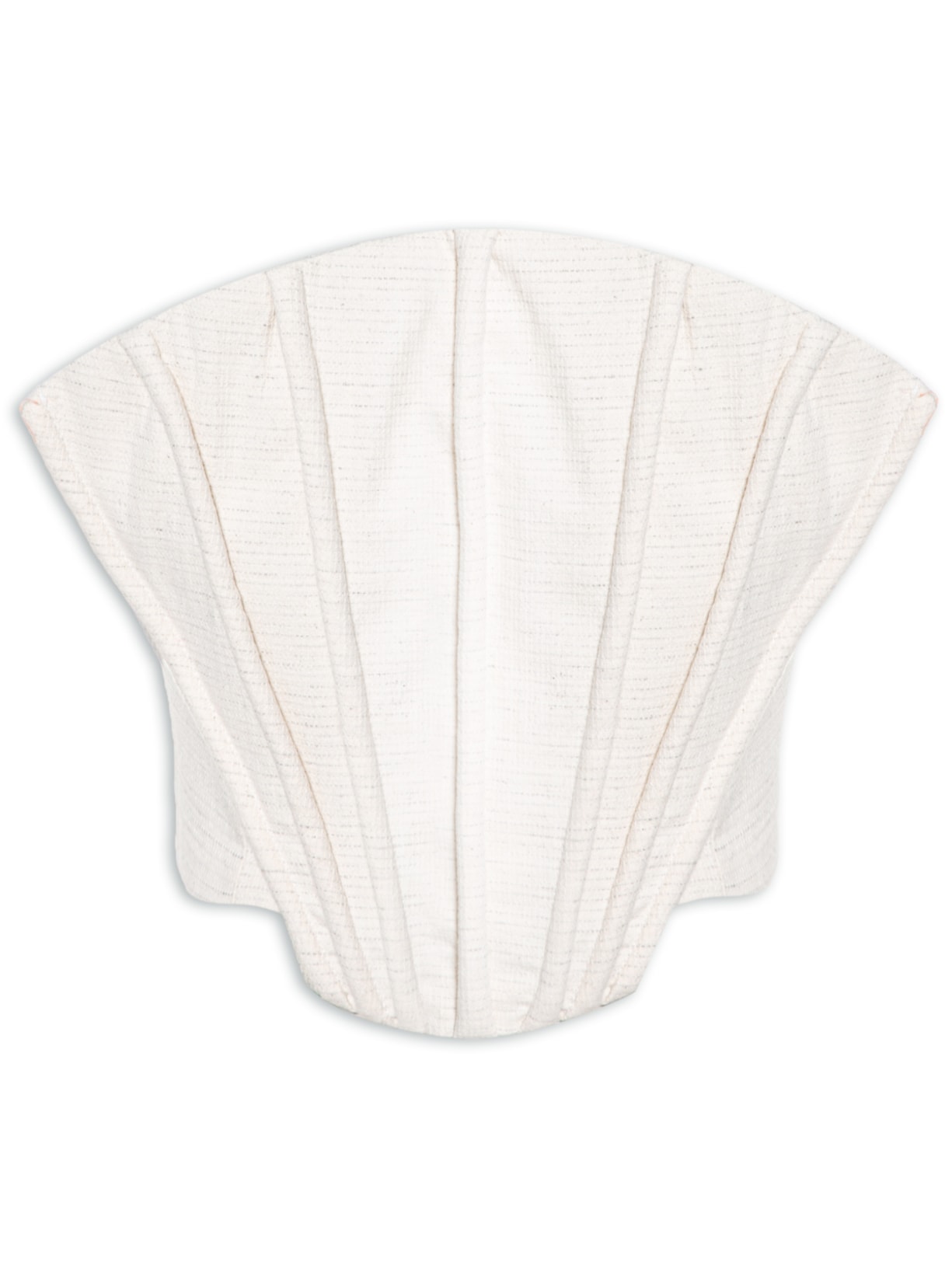 O top bege é confeccionado em tecido leve com toque de linho orgânico. A peça de modelo tomara que caia possui decote curvo, sobreposição frontal com recortes, comprimento cropped*, shape justo, caimento reto, acabamento pespontado e fechamento posterior por zíper com vista sobreposta.