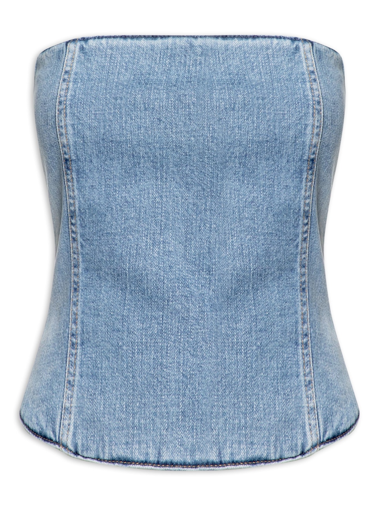 O top azul é confeccionado em sarja com lavagem jeans de baixa elasticidade. A peça de modelo tomara que caia, possui decote reto, recortes frontais e posteriores, lastex aplicado na parte posterior, tecido duplo, efeito estonado, barra arredondada na parte frontal, comprimento cropped* e fechamento posterior por zíper metálico.