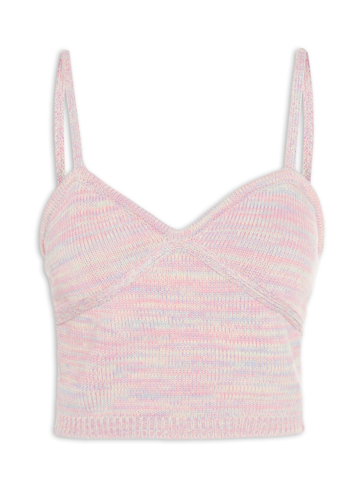 O top rosa é confeccionado em tricot com fios mesclados em tons contrastantes. A peça possui decote coração, alças finas, recorte abaixo do busto, comprimento cropped e acabamento canelado.