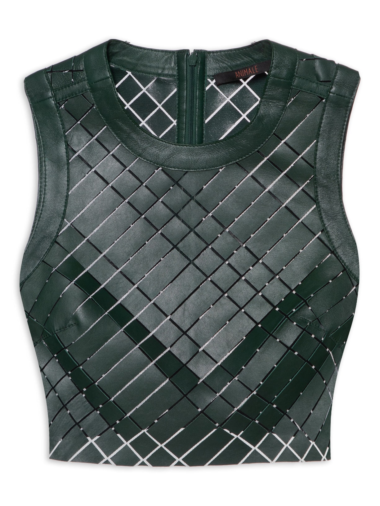 O top verde é confeccionado em couro. A peça solta ao corpo possui decote redondo, alças largas, recorte frontal e posterior com padronagem geométrica, transparência, comprimento cropped* e fechamento posterior por zíper.