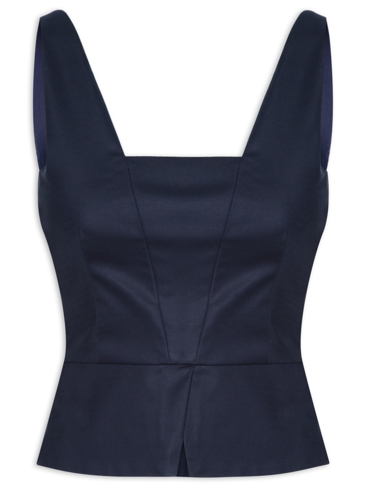 O top azul marinho é confeccionado em lã sem elasticidade. A peça solta ao corpo possui decote quadrado, alças largas, cavas estendidas, pences frontais, recortes frontais e posteriores, recorte com aplicação de peplum com fenda frontal, forro, sem bojo e fechamento posterior em zíper invisível.