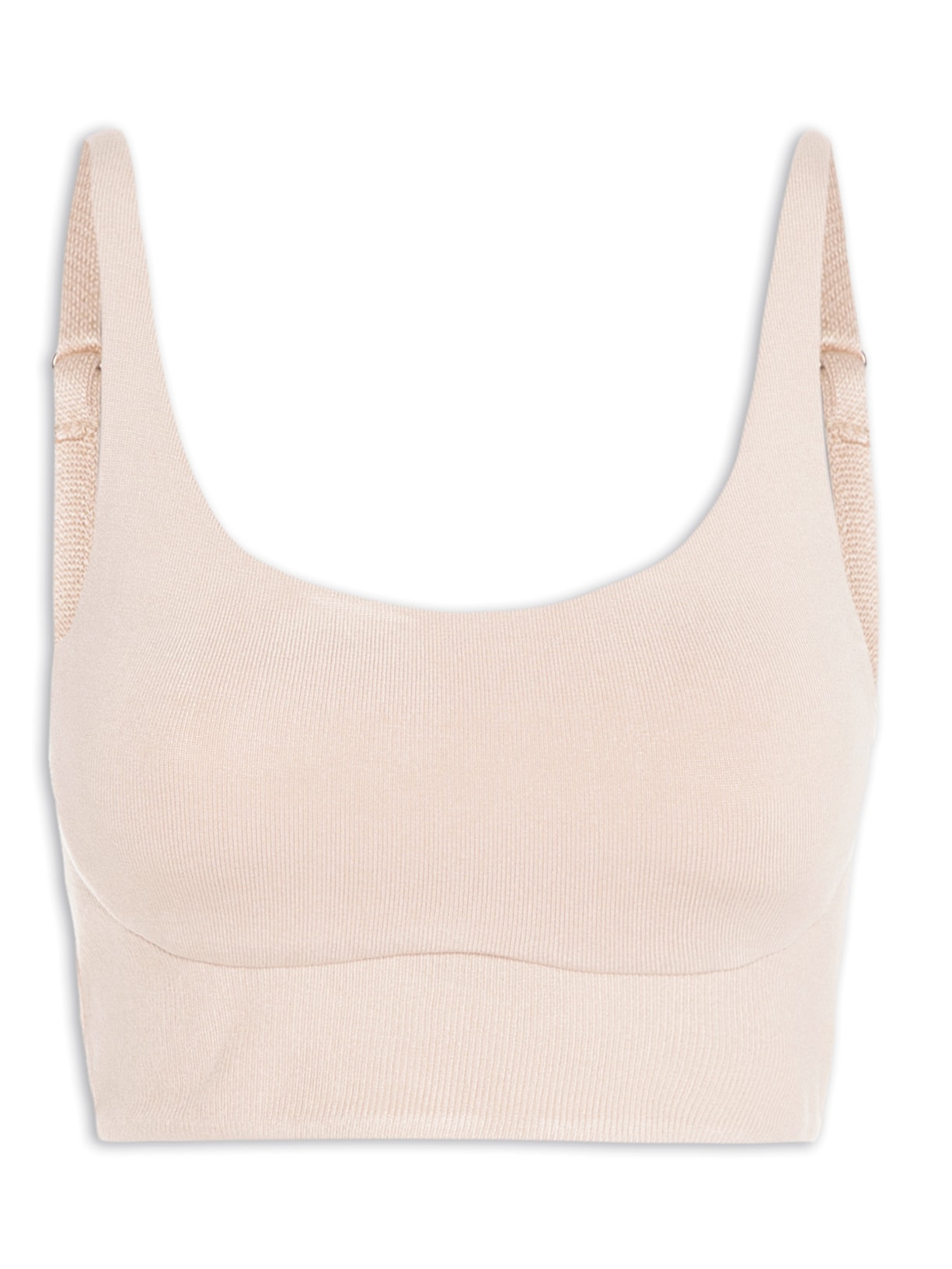 O top bege é confeccionado em tricot. A peça possui decote em U, alças finas ajustáveis, forro, recorte frontal, comprimento curto, shape justo, caimento reto e acabamento canelado.