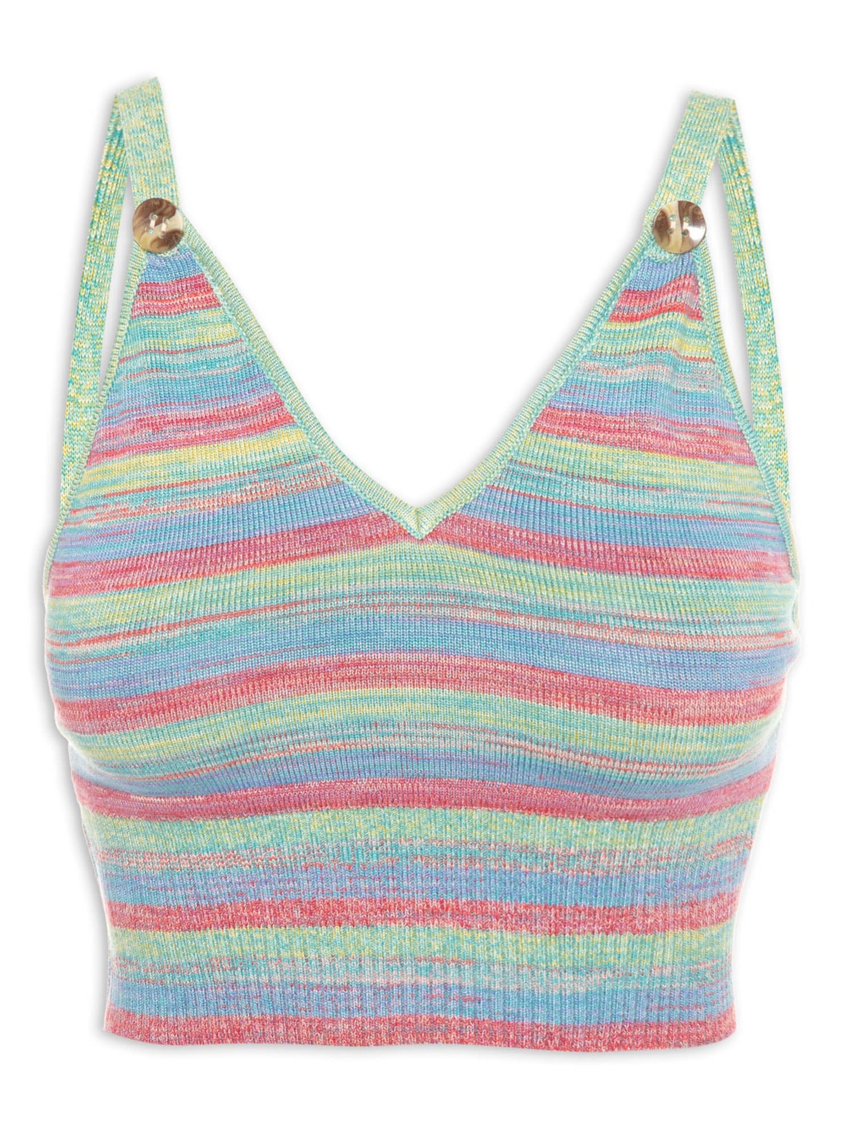 O top verde é confeccionado em tricot. A peça possui decote em V, alças finas com aplicação de botão marmorizado, padronagem de listras em cores contrastante, comprimento cropped, shape justo, caimento reto e acabamento canelado.