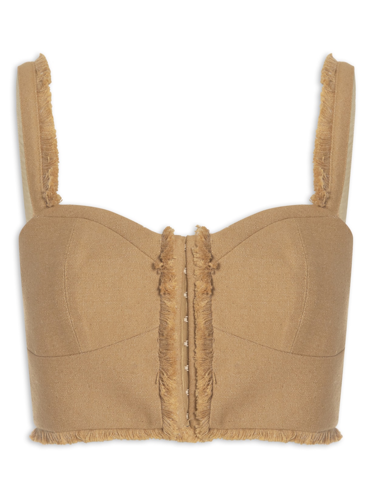 O top marrom é produzido em lona. A peça possui decote V, alças médias com aplicação de detalhes desfiado, recortes frontais na altura do busto, forro, comprimento cropped*, aplicação de desfiado na parte frontal e na barra, shape justo, caimento reto, acabamento pespontado e fechamento frontal por colchetes.