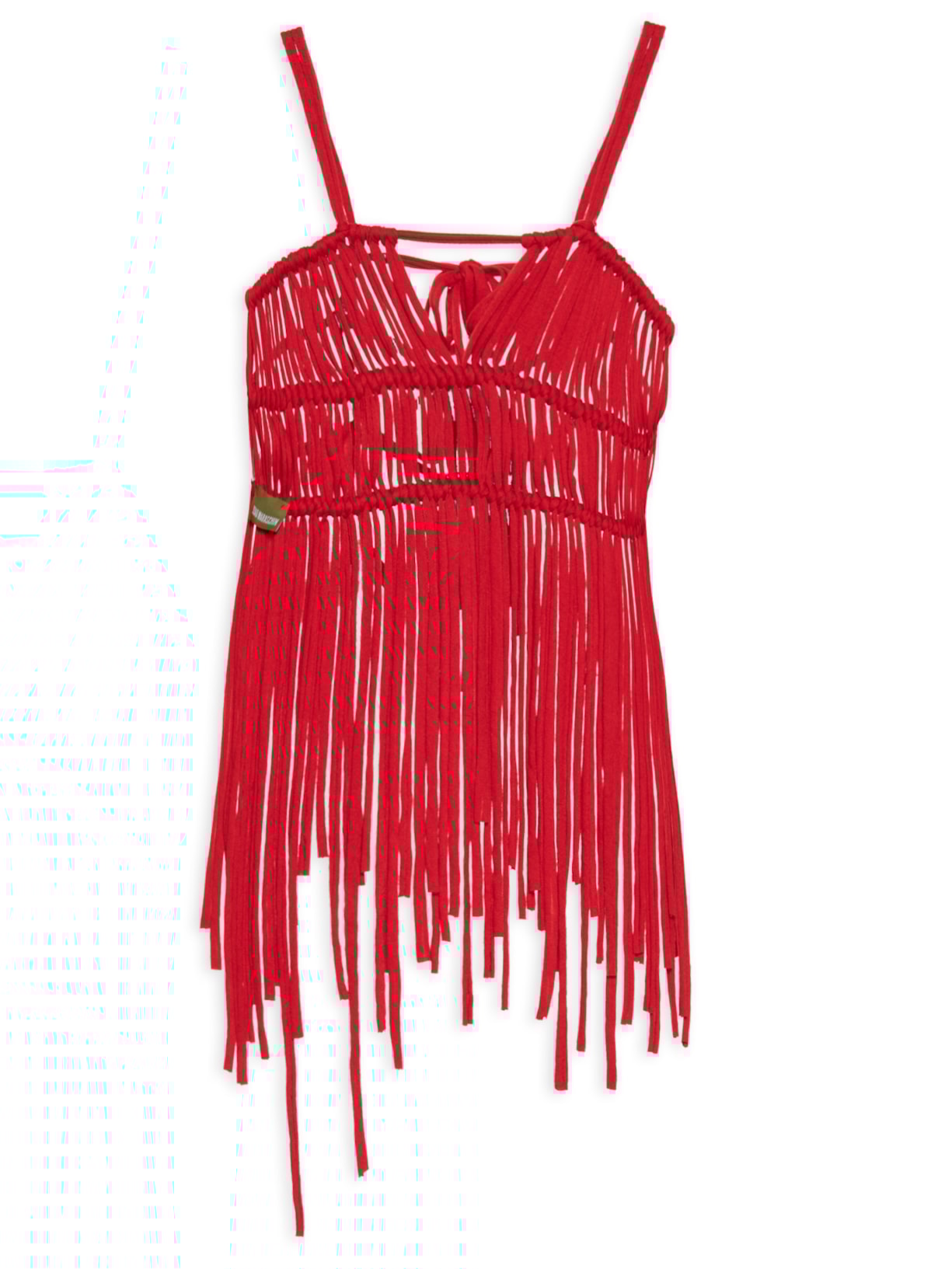 O top vermelho é confeccionado em macramê. A peça solta ao corpo possui decote trapézio, alças finas, recorte frontal vazado, recortes frontais acolchoados, barra em cordões assimétricos e fechamento posterior por cordões estendidos para amarração