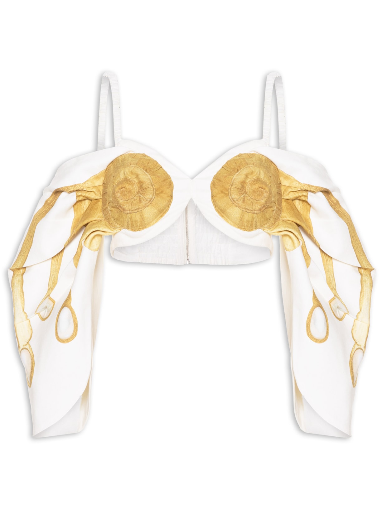 O top dourado é confeccionado em linho sem elasticidade. A peça justa ao corpo possui decote coração, alças finas com elástico embutido, mangas 7/8 deslocadas e bufantes com detalhe de pregas e barra assimétrica, recorte sobreposto no busto com formato circular e cor contrastante, elástico embutido na parte posterior, forro, sem bojo, comprimento cropped* e fechamento posterior por zíper.