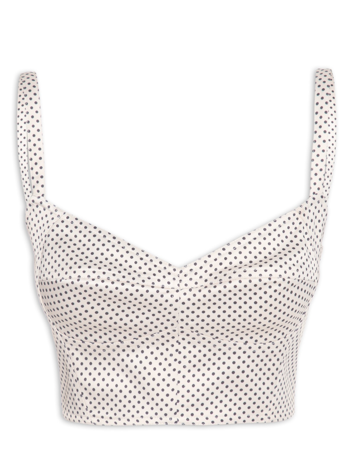 O top off white é confeccionado em tecido encorpado. A peça possui decote coração, alças médias, barbatanas nas laterais, recortes frontais, recorte posterior em lastex, estampa de poá em cor contrastante, forro, shape justo, caimento reto, acabamento pespontado e fechamento posterior por zíper.