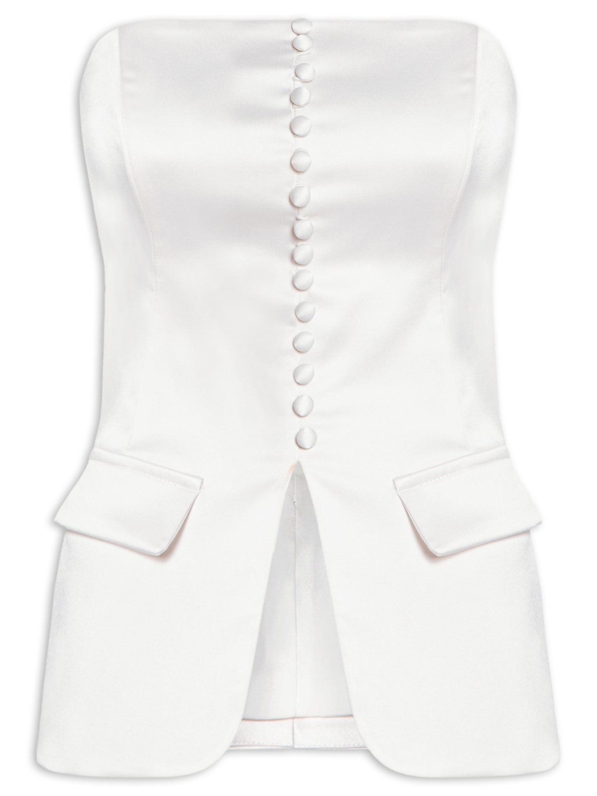 O top branco é confeccionado em tecido leve com baixa elasticidade. A peça justa ao corpo de modelo tomara que caia possui decote reto, recorte frontal com fenda e aplicação de botões decorativos, abas frontais decorativas, forro sem bojo e fechamento posterior por zíper invisível.