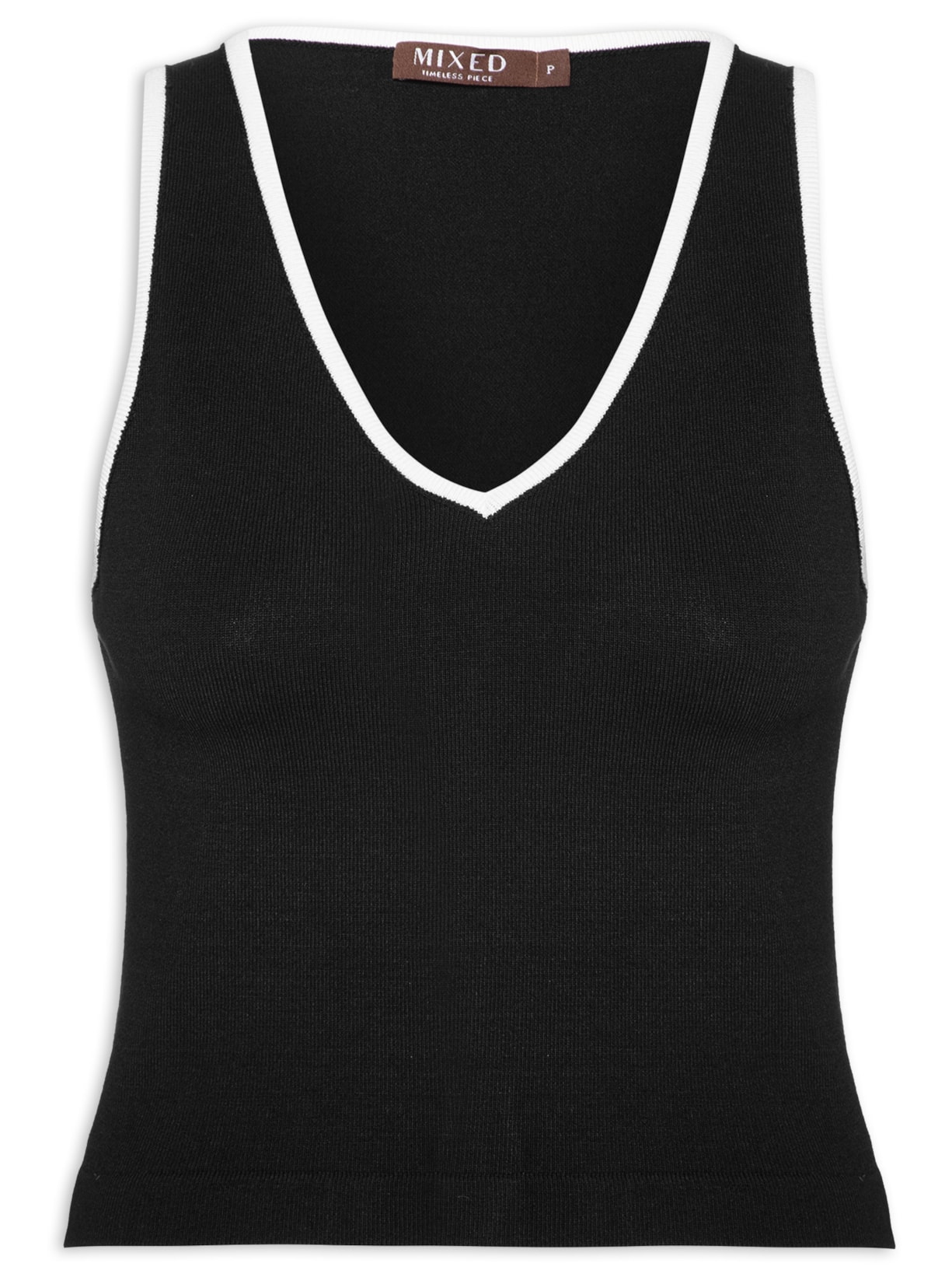O top preto é confeccionado em tricot com média elasticidade. A peça justa ao corpo possui decote V, alças médias, cavas regulares, decote e cavas com viés branco e comprimento cropped*.