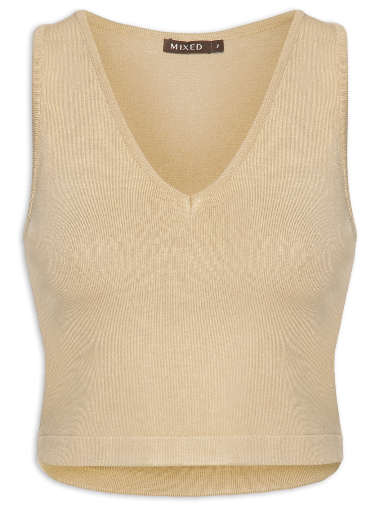 O top bege é confeccionado em tricot. A peça possui decote V, cavas regulares, comprimento cropped* e shape solto.