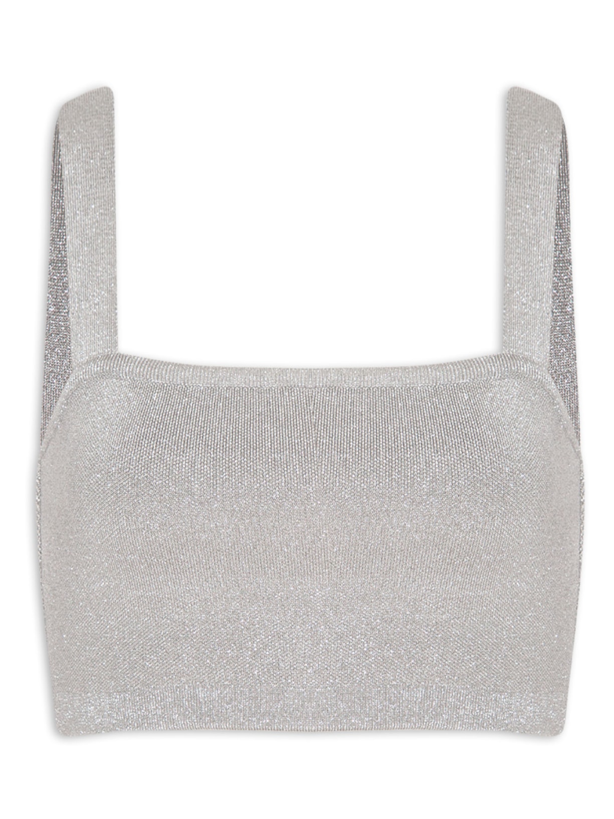 O top prata é confeccionado em tricot com fios em lurex. A peça possui decote quadrado, alças médias, tag metalizada da marca aplicada na parte posterior, comprimento cropped, shape justo, caimento reto e acabamento canelado.
