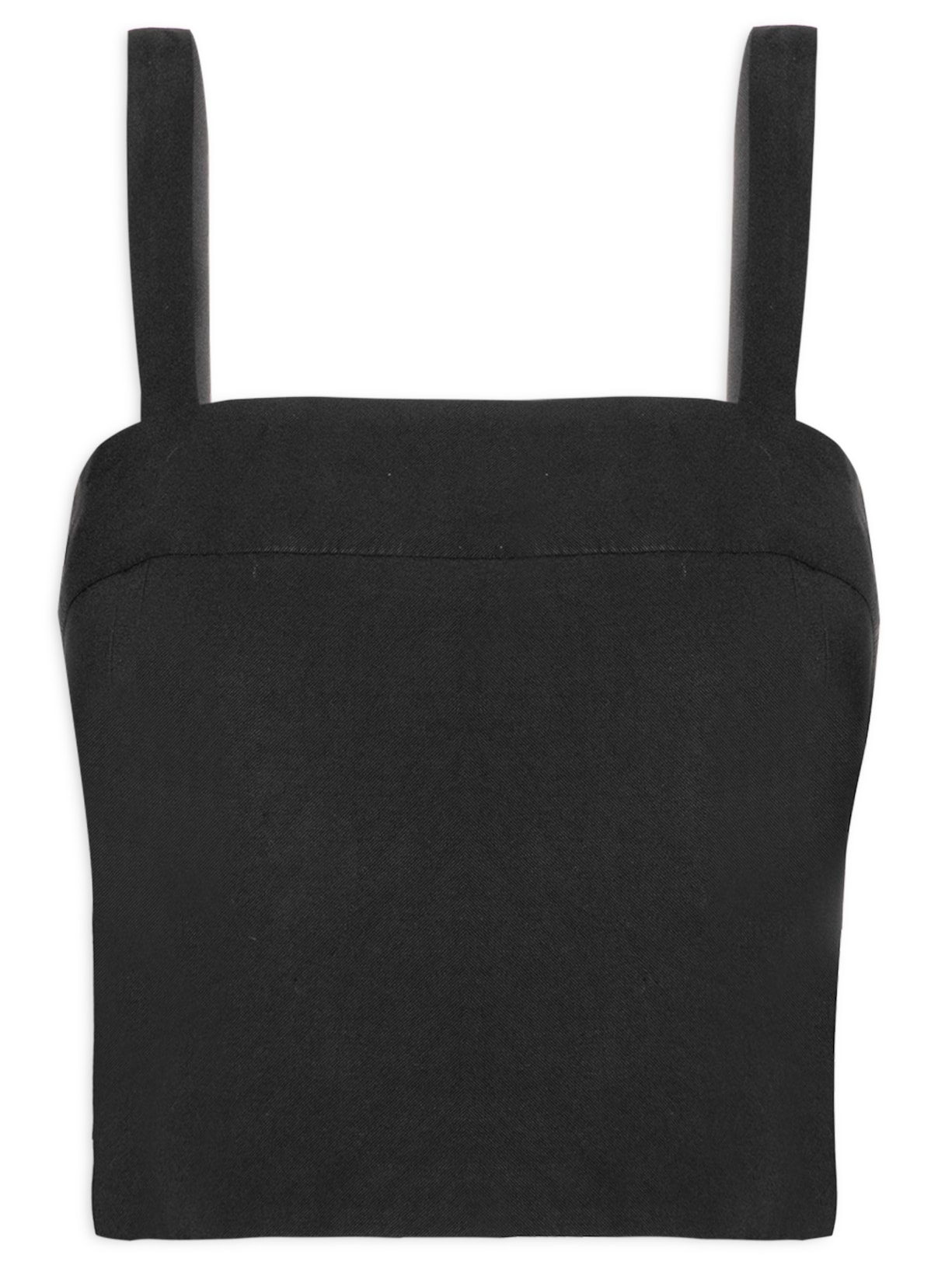 O top preto é confeccionado em tecido leve. A peça possui decote frontal e posterior reto, alças finas, cavas regulares, recortes posteriores e frontais, forro, comprimento cropped*, shape justo e fechamento posterior por zíper.