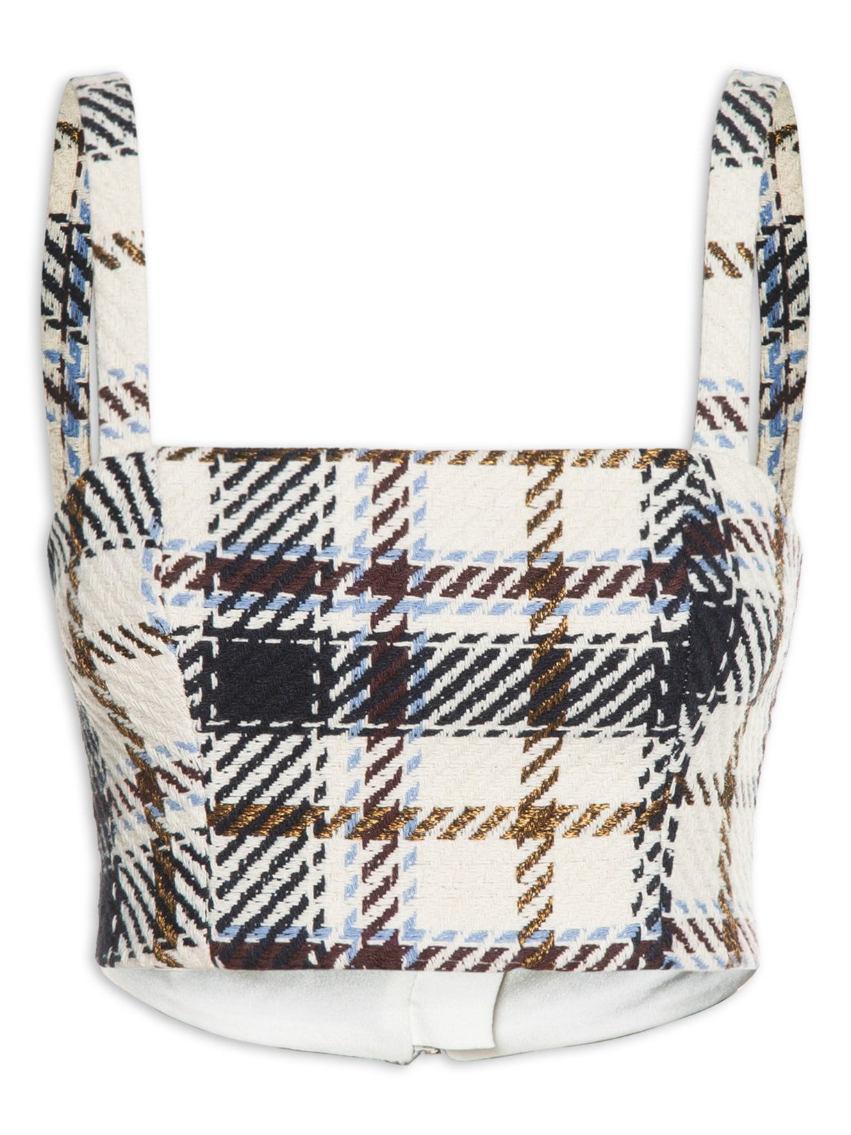 O top off white é confeccionado em jacquard com fios de lurex. A peça possui decote frontal e posterior quadrado, alças médias, recortes frontais e posteriores, padronagem xadrez em cores contrastantes, forro, comprimento cropped*, shape justo, caimento reto, acabamento pespontado e fechamento posterior por zíper metalizado.
