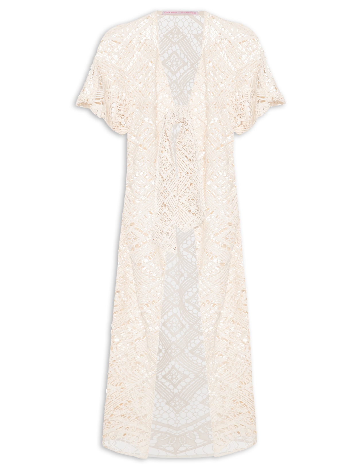 A túnica off white é confeccionada em crochet. A peça possui caimento reto, mangas curtas, comprimento alongado, caimento reto, acabamento pespontado e fechamento frontal por amarração
