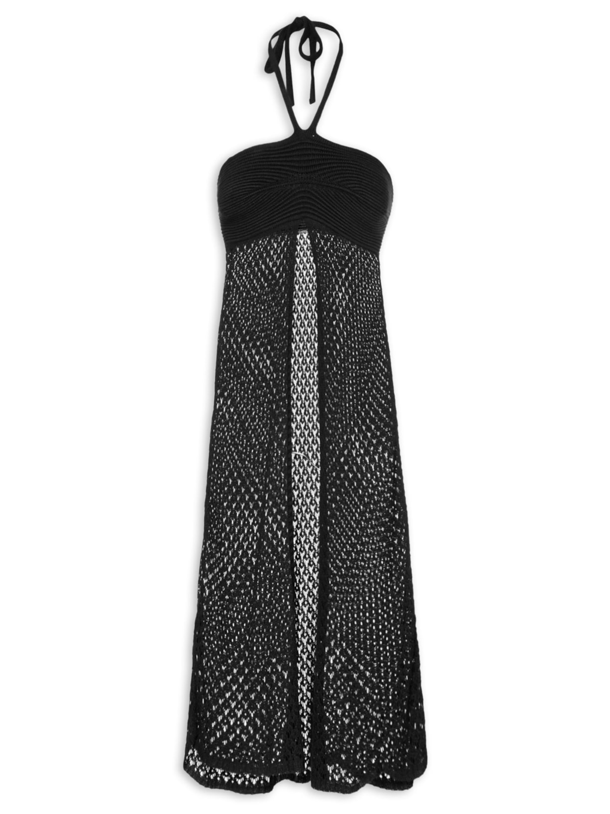 A túnica preta é confeccionada em tricot com alta elasticidade. A peça justa na altura do busto e solta no comprimento, possui decote halter, alças médias estendidas para amarração posterior, recorte na altura do busto com superfície texturizada, transparência, fenda frontal e comprimento alongado.