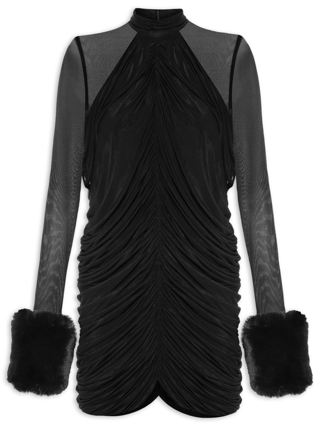O vestido preto é confeccionado em tule de média elasticidade. A peça justa ao corpo possui gola alta, mangas longas com punhos removíveis em pelúcia, recorte sobreposto com efeito drapeado na parte frontal e posterior, transparência, comprimento curto e fechamento posterior por zíper invisível.
