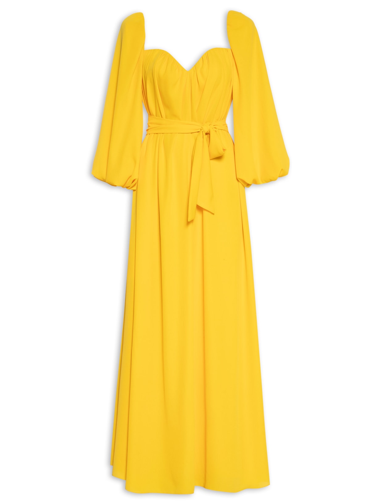 O vestido amarelo é confeccionado em tecido leve sem elasticidade. A peça solta ao corpo possui decote coração com barbatanas embutidas para sustentação e detalhe de franzido, mangas longas bufantes com elástico embutido nos ombros e nos punhos, forro, comprimento longo e fechamento posterior por zíper invisível. Acompanha faixa de mesma cor e tecido para uso opcional.