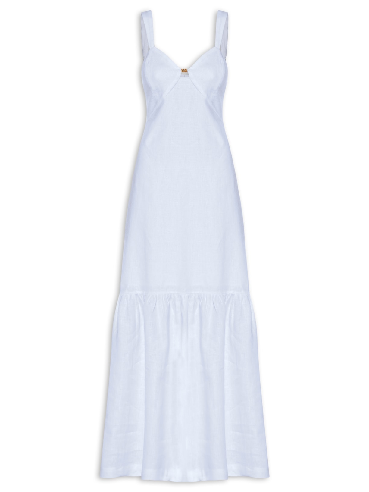 O vestido azul é confeccionado em linho sem elasticidade. A peça solta ao corpo possui decote coração, alças médias com elástico embutido na parte posterior, cavas alongadas, elástico embutido na parte posterior com aplicação de colchetes para fechamento, recorte vazado na parte frontal com detalhe de aviamento metalizado em formato orgânico, recortes frontais e posteriores, comprimento longo, forro e fechamento posterior por zíper.