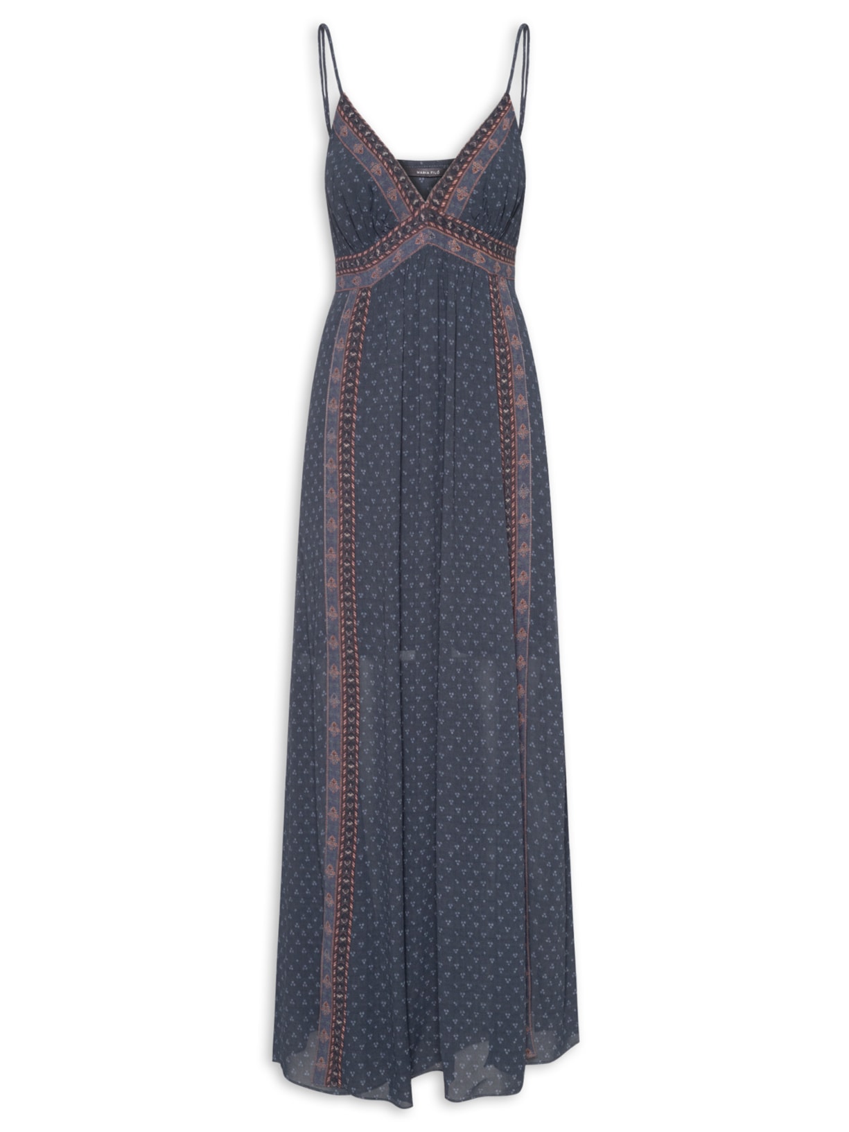 O vestido azul é confeccionado em crepe sem elasticidade. A peça justa ao busto e solta no comprimento possui decote V, alças finas reguláveis, recorte abaixo do busto com efeito franzido, fendas laterais, forro curto, mix de estampas em cores contrastantes, comprimento longo e fechamento lateral por zíper invisível.