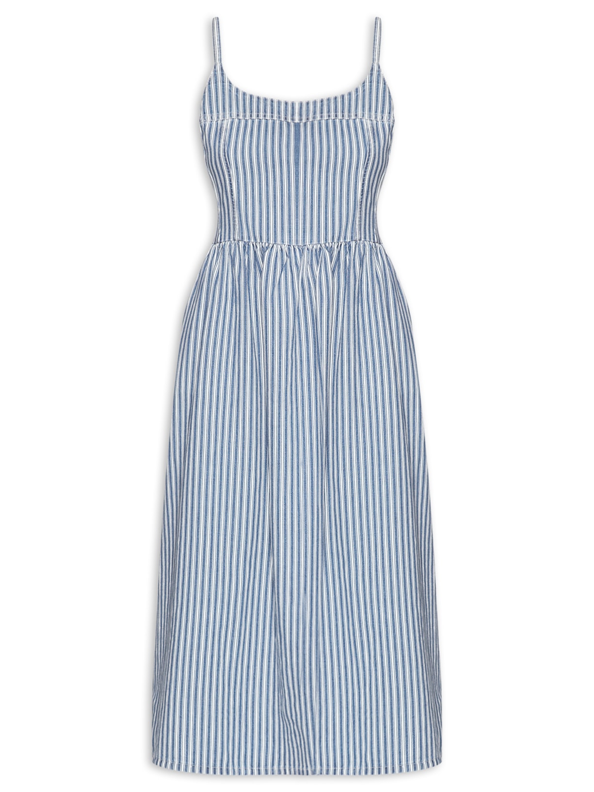O vestido azul é confeccionado por sarja com lavagem em jeans sem elasticidade. A peça solta ao corpo possui decote U, alças finas com regulagem na parte posterior, cavas alongadas, aplicação de lastex na parte posterior, padronagem de listras na cor branca, bolsos frontais embutidos, recortes frontais e posteriores, comprimento midi e fechamento lateral por zíper.