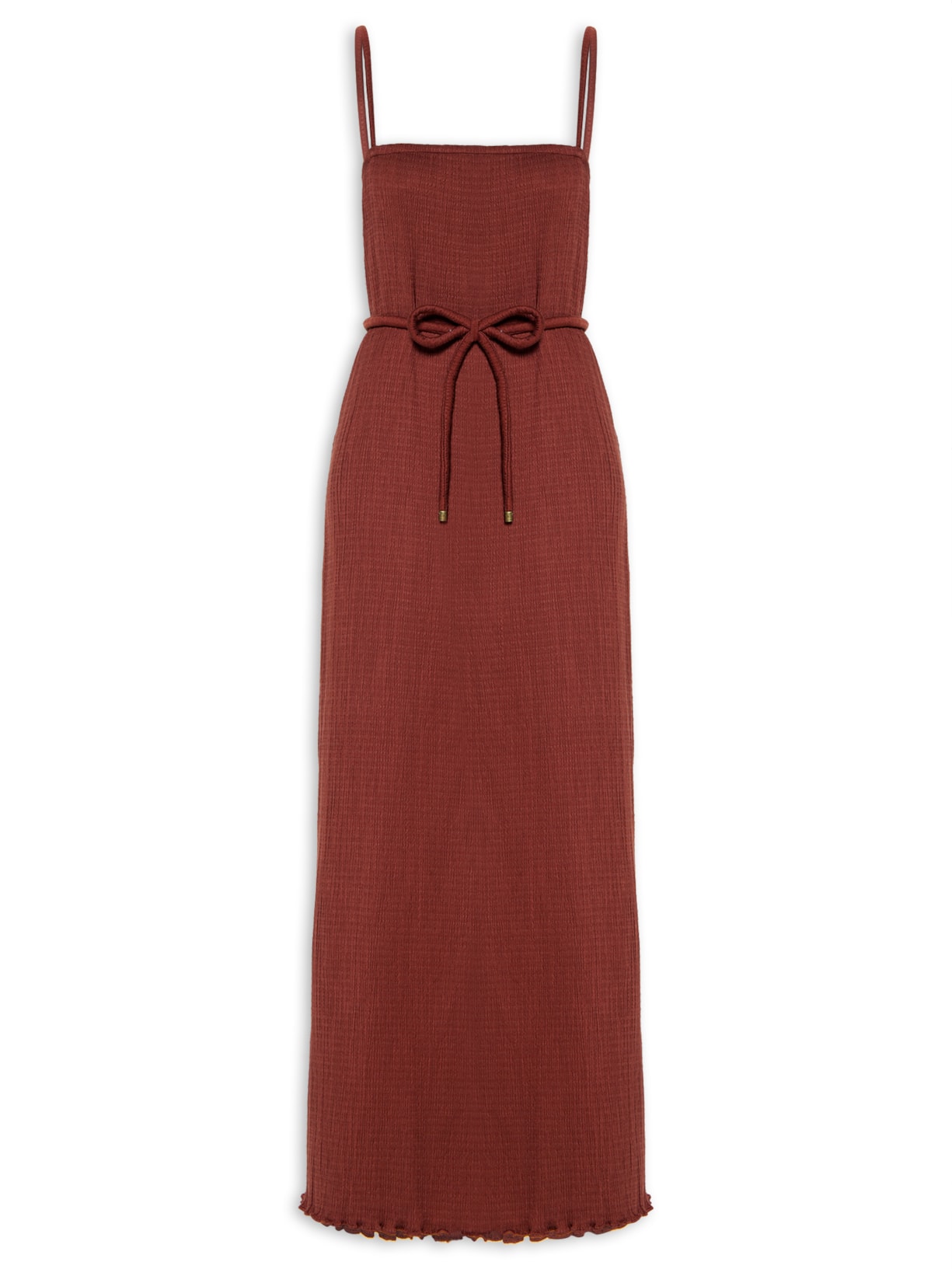 O vestido marrom é confeccionado em malha com alta elasticidade e superfície texturizada. A peça solta no corpo possui decote reto com elástico embutido, alças finas e comprimento longo. Acompanha cordão de mesma cor com ponteiras metálicas para uso opcional