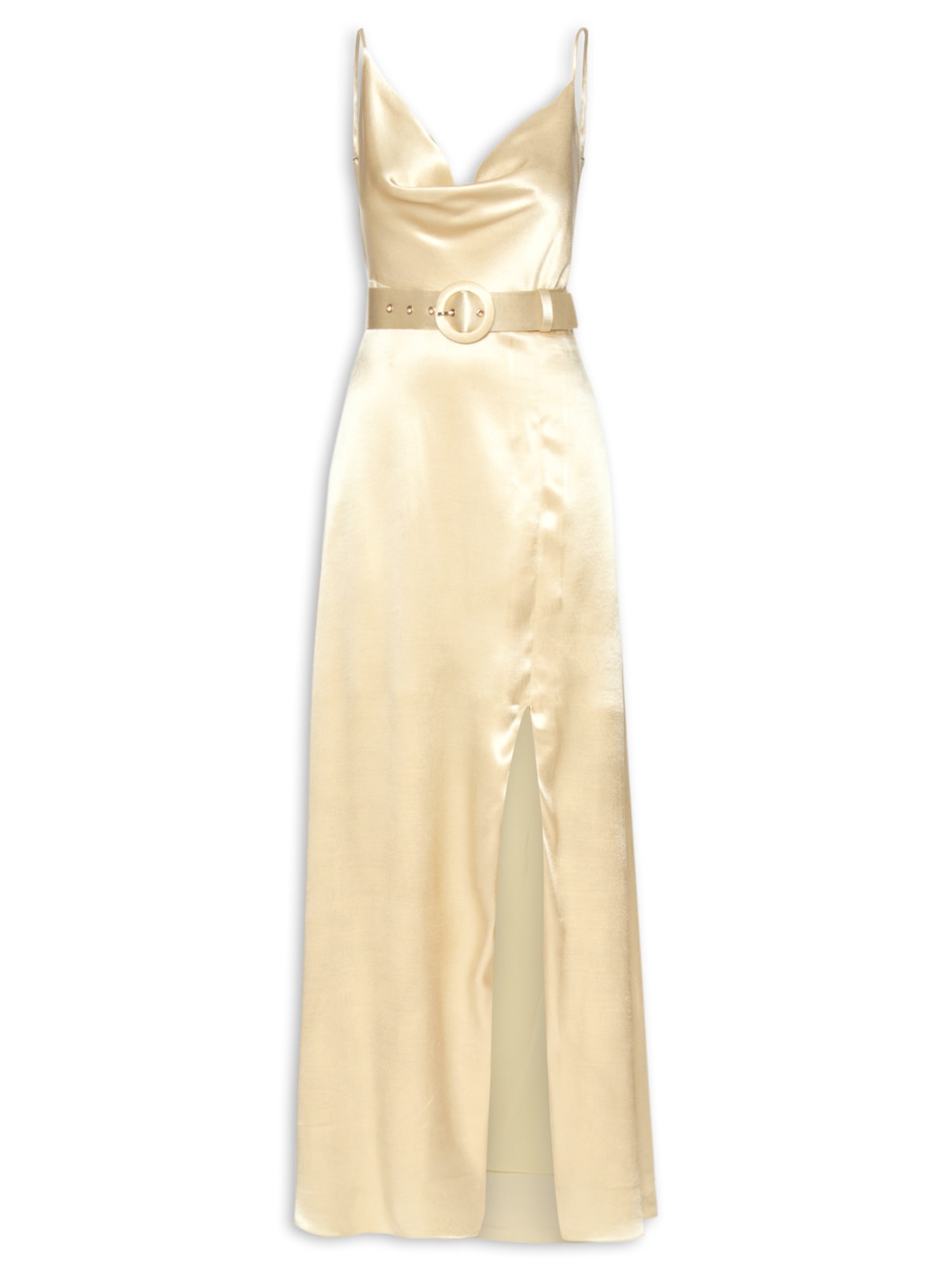 O vestido amarelo é confeccionado em tecido leve com superfície acetinada sem elasticidade. A peça justa ao busto e solta no comprimento possui decote degagê, alças finas reguláveis, recorte na altura da cintura, recorte com fenda na parte frontal e comprimento longo.