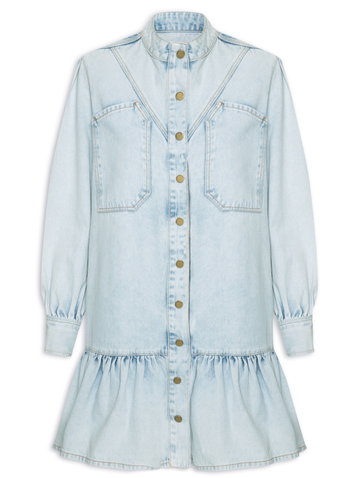 O vestido azul é confeccionado em sarja com lavagem jeans sem elasticidade. A peça solta ao corpo possui gola padre, mangas longas com detalhe de prega e abotoamento nos punhos, recortes frontais e posteriores, bolsos frontais, recorte inferior com detalhe de pregas, comprimento curto e fechamento frontal em botões.