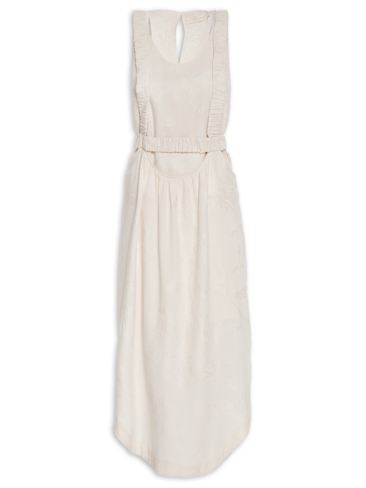 O vestido off white é confeccionado em jacquard. A peça possui alças médias com elástico aplicado, barra arredondada, comprimento midi, shape solto, caimento reto e acabamento pespontado. Acompanha forro de mesma cor e tecido e fechamento posterior por botão.