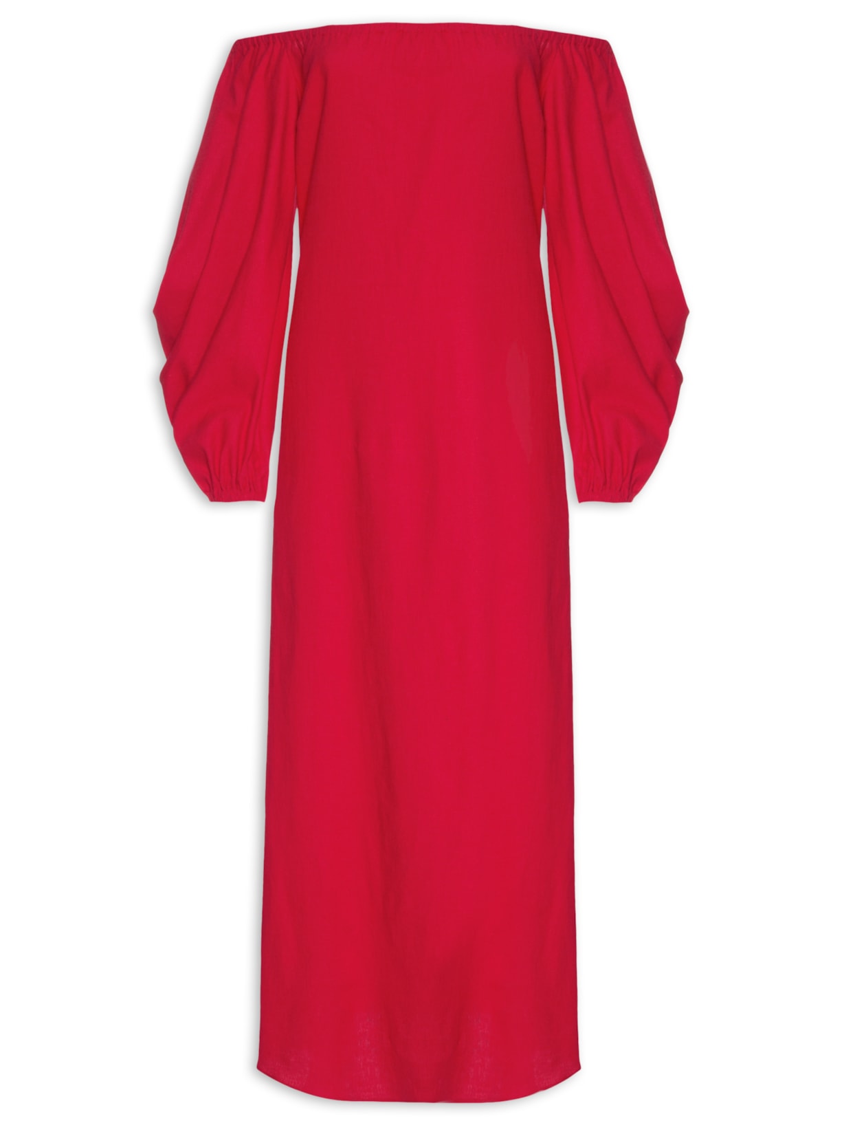 O vestido vermelho é confeccionado em tecido leve com toque de linho e média elasticidade. A peça solta ao corpo possui decote ombro a ombro com elástico embutido, mangas longas balone com elástico nos punhos, comprimento longo, acabamento pespontado na barra.