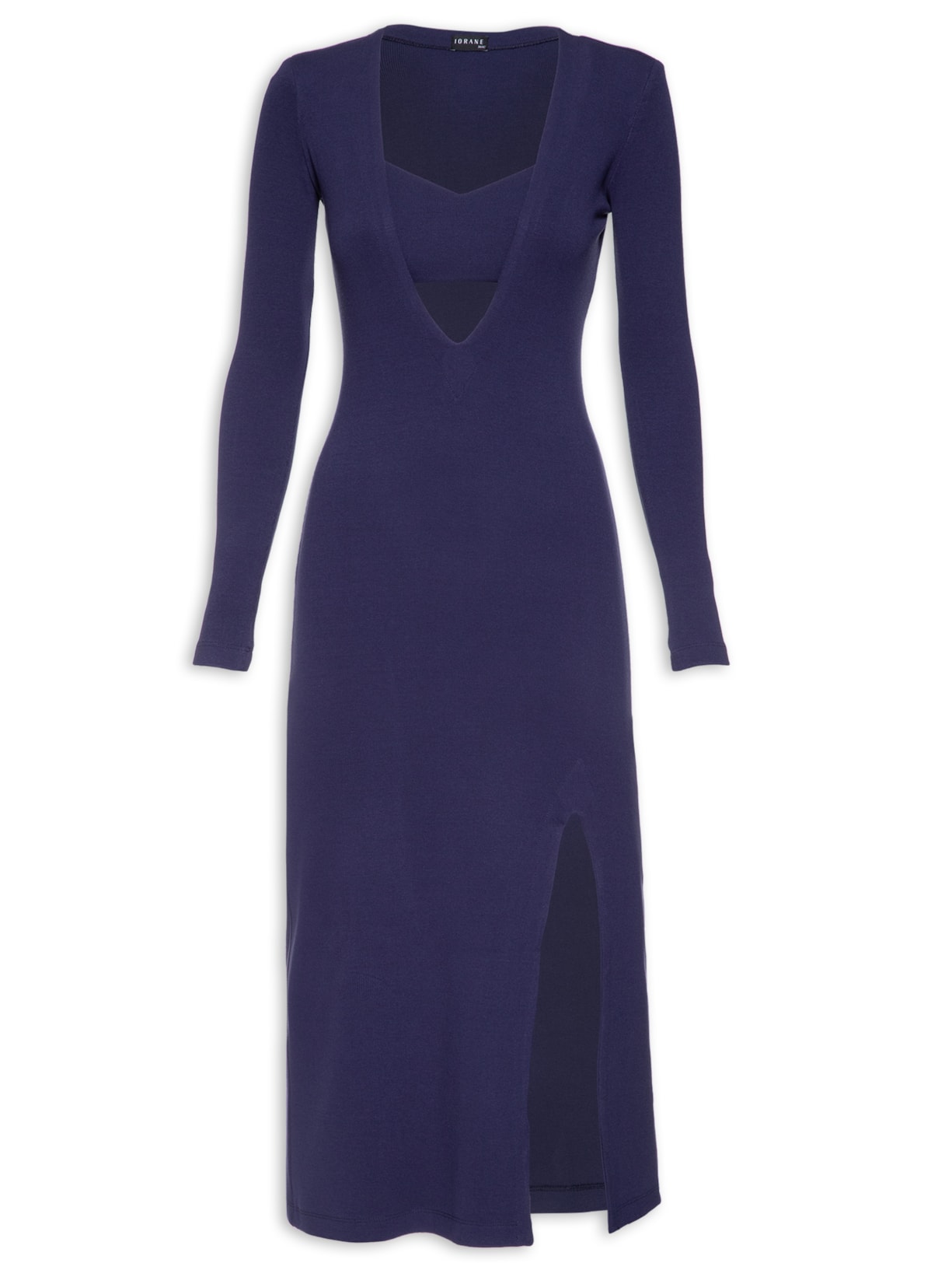 O vestido azul marinho é confeccionado em tricot canelado. A peça possui decote V profundo, ombreiras, mangas longas, fenda frontal, comprimento midi, shape solto, caimento reto e acabamento canelado. O top possui decote V, alças finas, forro, comprimento cropped*, shape justo, caimento reto, acabamento canelado e fechamento posterior por colchetes.