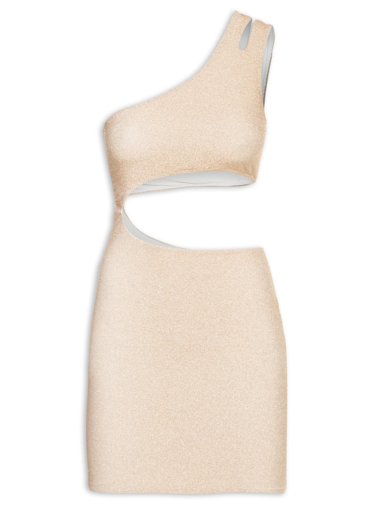 O vestido bege é confeccionado em malha de poliamida com fios de lurex. A peça possui decote ombro único com tag metalizada da marca aplicada na parte posterior, alça média com recorte vazado, cava regular, recorte vazado na altura da cintura, forro, comprimento curto e shape justo.