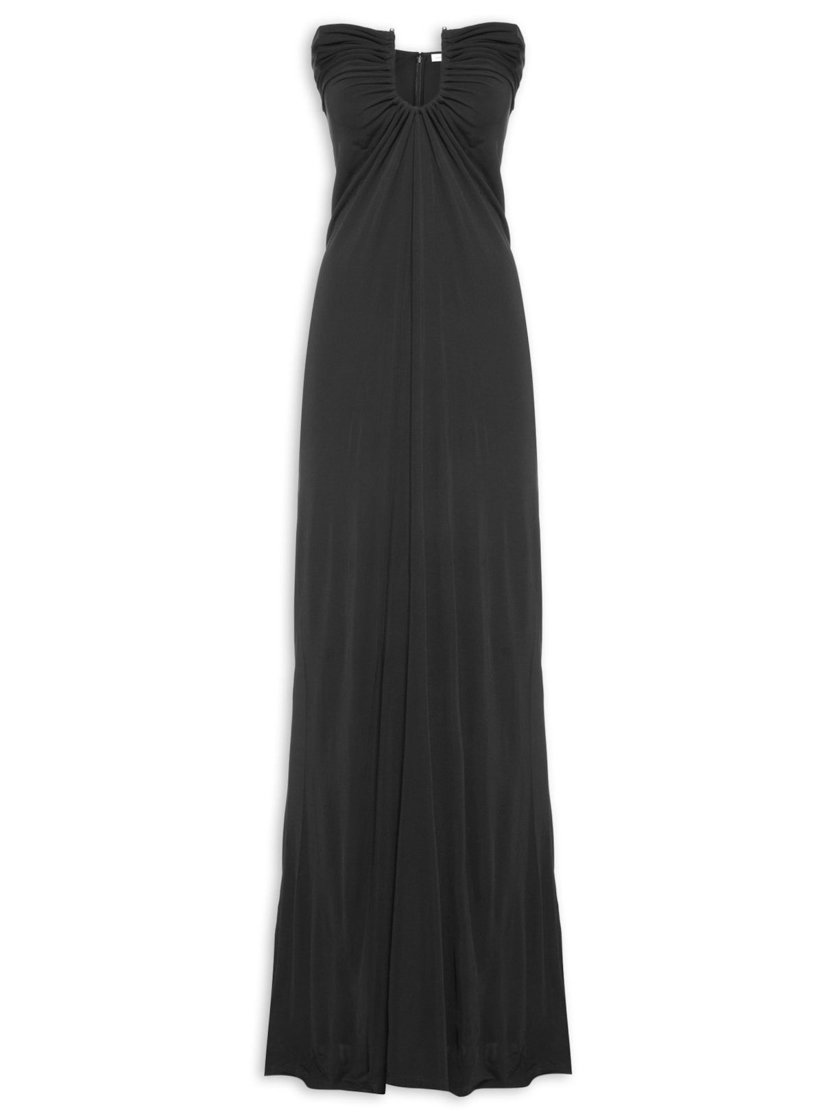 O vestido preto é confeccionado em tecido leve de baixa elasticidade. A peça justa ao busto e solta no comprimento de modelo tomara que caia possui decote U com aro metálico embutido e ponteiras esféricas, comprimento longo e fechamento posterior em zíper invisível.