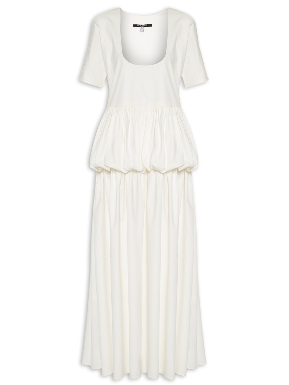 O vestido branco é confeccionado em seda encorpada sem elasticidade. A peça possui decote U profundo, mangas curtas com recortes vazados, recorte frontal e posterior com detalhes de franzidos na altura da cintura e aplicação de peplum sobreposto com superfície drapeada, comprimento longo e fechamento lateral por zíper invisível.