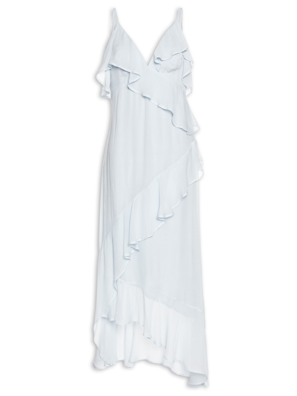 O vestido azul é confeccionado em tecido leve sem elasticidade. A peça solta ao corpo possui decote V, alças finas com regulagem, recortes posteriores, recortes frontais com babado, sem bojo, comprimento midi, forro, assimetria, leve transparência na altura da barra e fechamento lateral por zíper invisível.