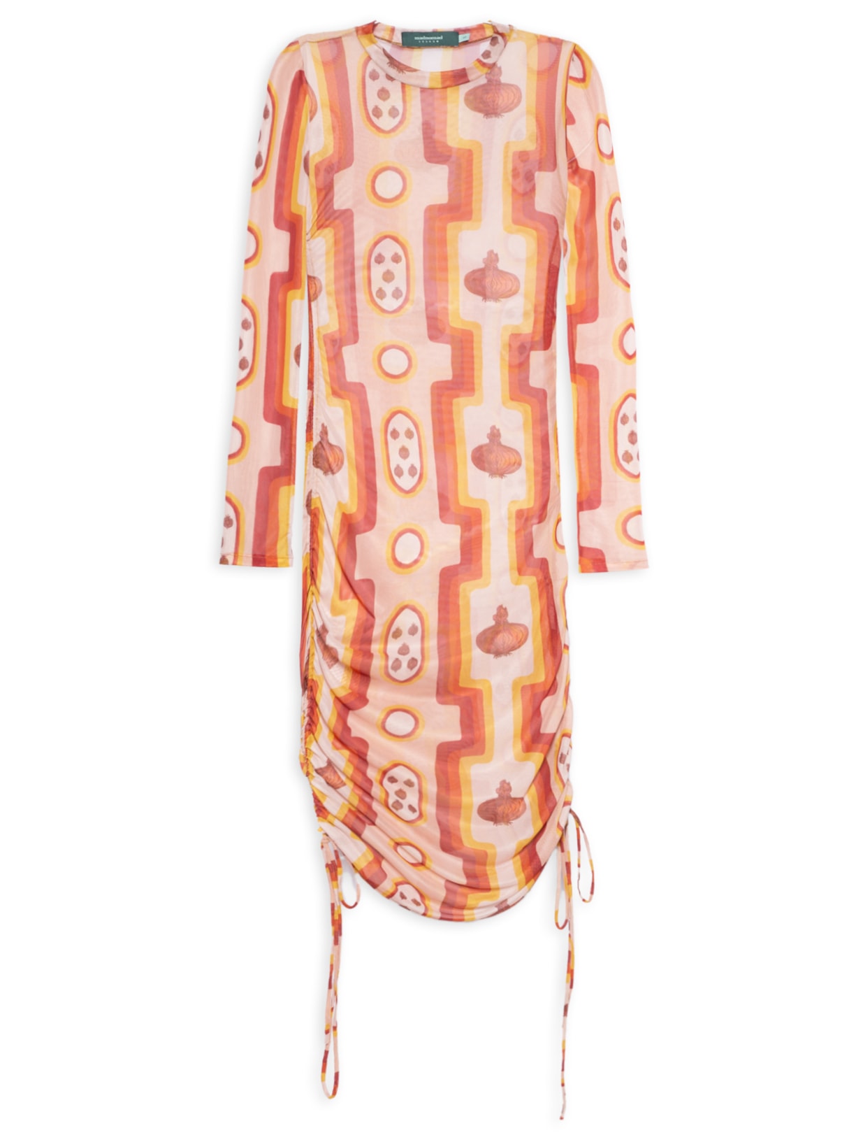 O vestido laranja é confeccionado em tule com alta elasticidade. A peça justa ao corpo possui decote redondo, mangas longas, laterais com detalhes de franzidos ajustáveis por cordões embutidos, estampa geométrica e figurativa de cebola em cores contrastantes, transparência, comprimento curto, sem forro e sem fechamento.
