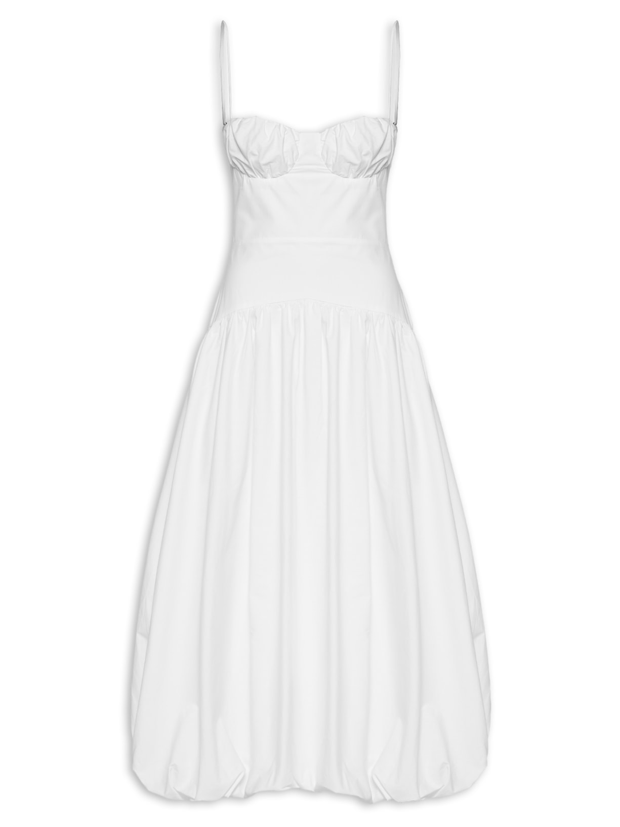 O vestido branco é confeccionado em tecido leve sem elasticidade. A peça justa ao busto e solta ao comprimento possui decote meia taça, alças finas com regulagem na parte posterior, cavas estendidas, lastex aplicado na parte posterior, recortes frontais e posteriores, barra com elástico embutido na barra e acabamento balonê, forro, comprimento midi e fechamento posterior por zíper.