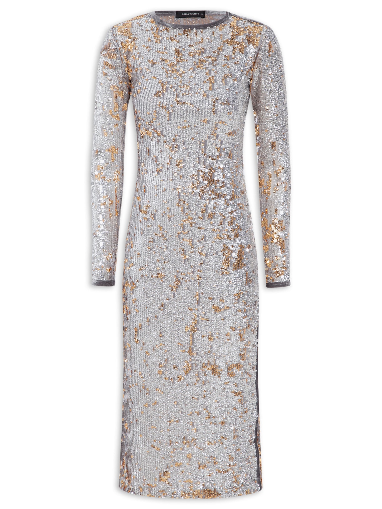 O vestido cinza é confeccionado em tecido leve com superfície em paetês. A peça possui decote redondo, mangas longas, comprimento midi, shape justo e fechamento posterior por zíper. O forro possui decote redondo, alças médias, cavas regulares, comprimento curto e shape justo.