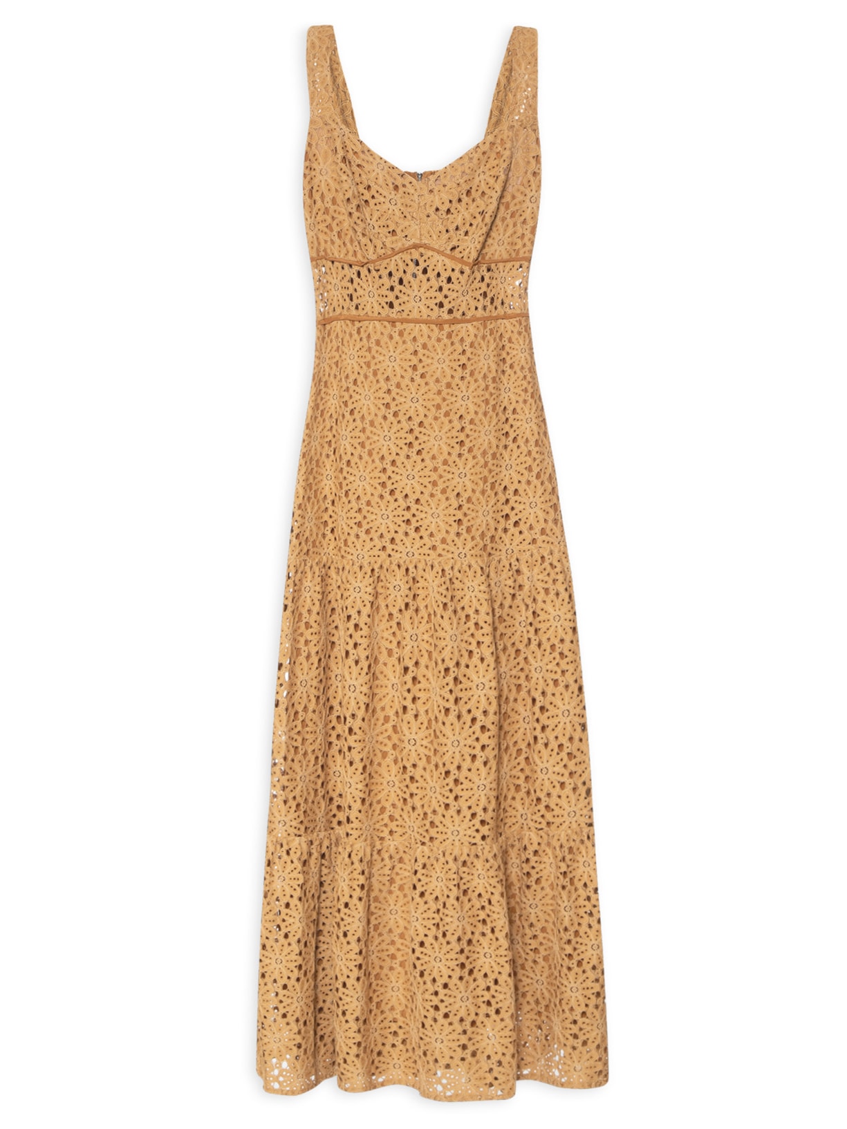 O vestido marrom é confeccionado em renda sem elasticidade. A peça justa na altura do busto e solta no comprimento, possui decote em V, alças médias, recortes frontais com detalhe aplicado, recortes na saia com detalhe franzido, lastex aplicado na parte posterior, transparência na cintura, comprimento midi, forro e fechamento posterior por zíper metálico.