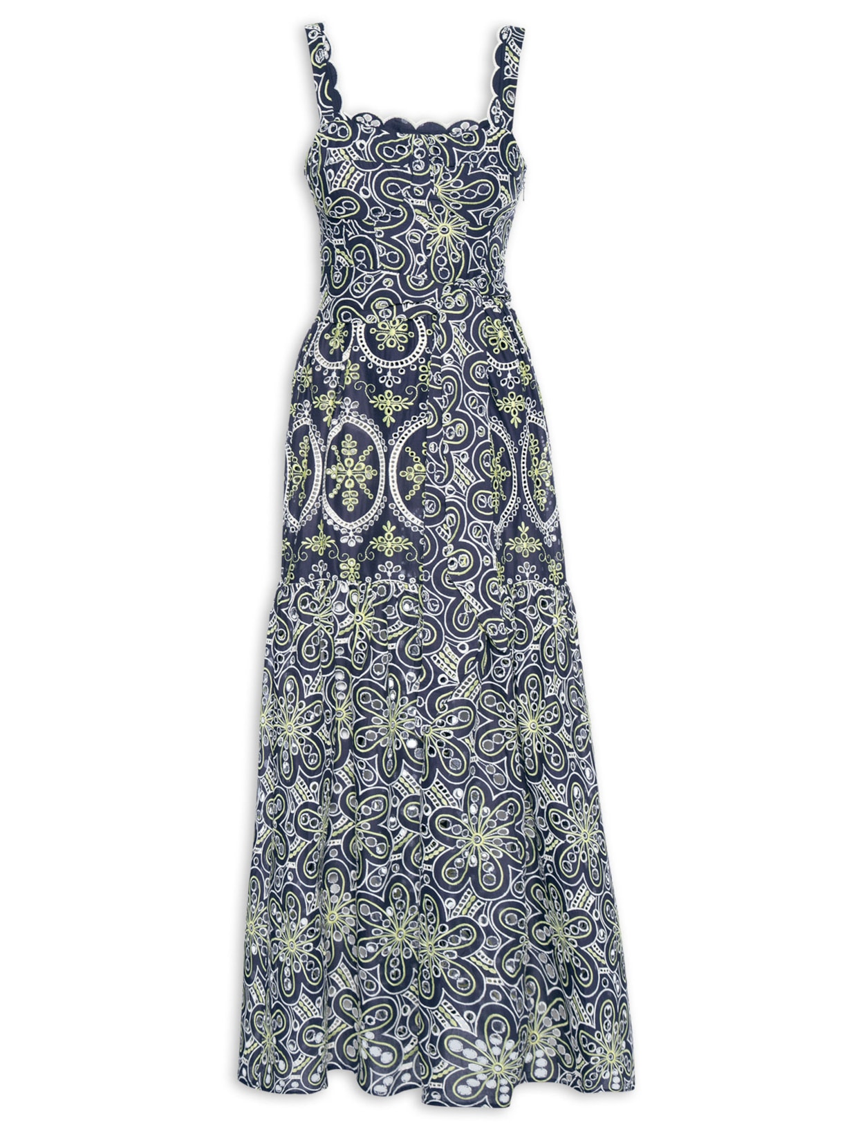 O vestido azul marinho é confeccionado em laise sem elasticidade. A peça justa no busto e solta no comprimento, possui decote quadrado com detalhe ondulado de bordado em cor contrastante aplicado, alças médias, recortes frontais, franzido na cintura e abaixo do quadril, mix de bordados florais em cores contrastantes, lastex aplicado na parte posterior, tag metalizada da marca aplicada na parte posterior do decote, comprimento longo, forro e fechamento lateral por zíper metálico. Acompanha faixa larga em mesmo tecido com bordados florais de cores contrastantes para amarração opcional.