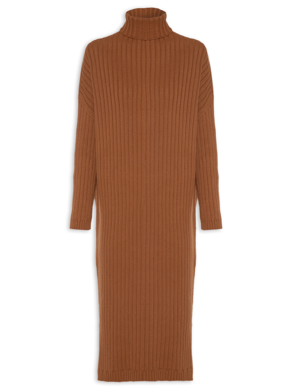 O vestido marrom é confeccionado em tricot canelado. A peça possui gola rulê, ombros estendidos, mangas longas, fendas laterais, comprimento midi, shape justo, caimento reto e acabamento canelado.