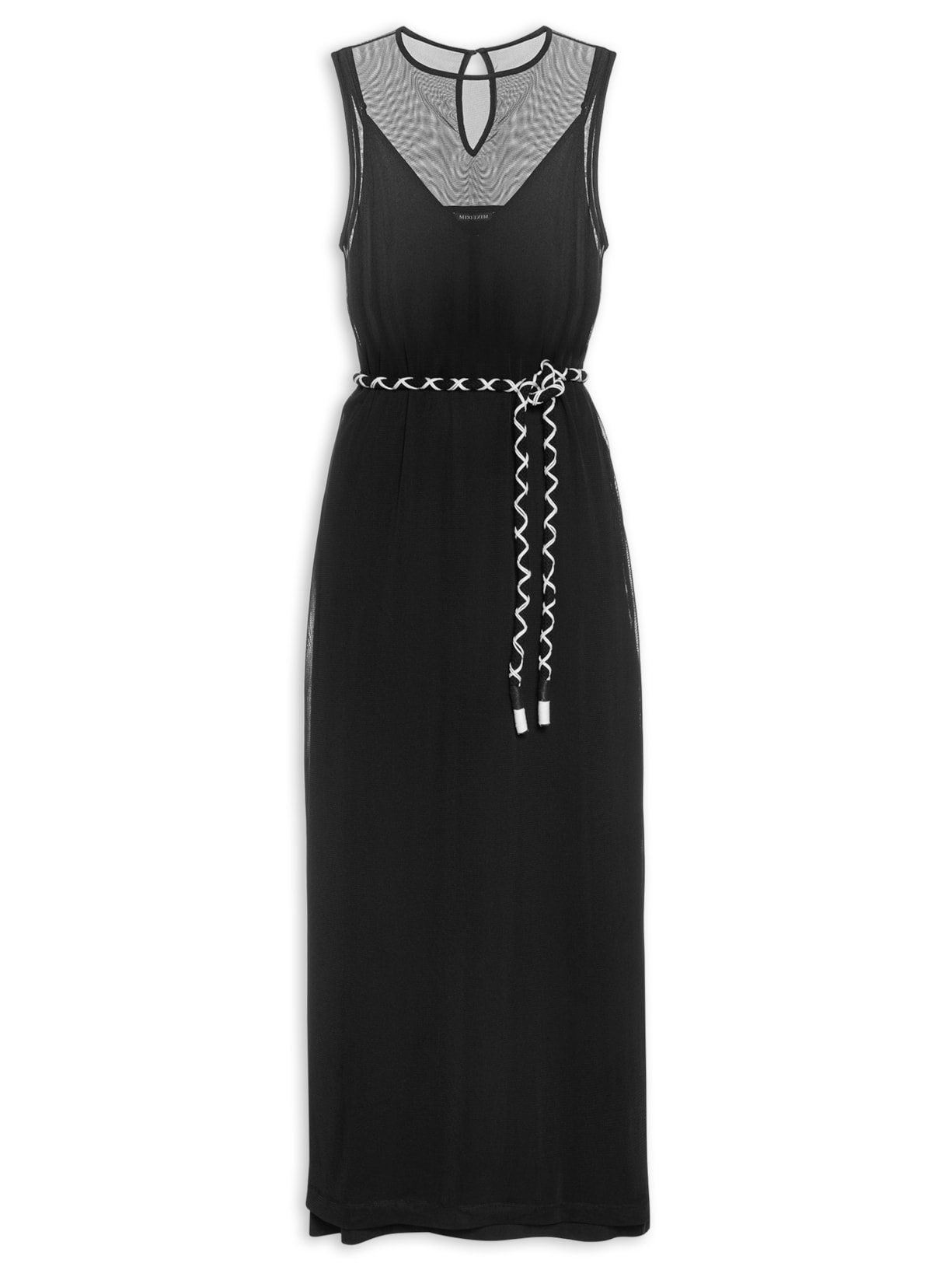 O vestido preto é confeccionado em tule com alta elasticidade. A peça solta ao corpo possui decote redondo, recorte posterior vazado com botão aplicado, alças largas e comprimento midi. Acompanha cinto em corda média com barbantes entrelaçados na cor off white e fechamento por amarração e forro de malha para uso opcional na mesma cor com decote V, alças finas reguláveis e comprimento midi.