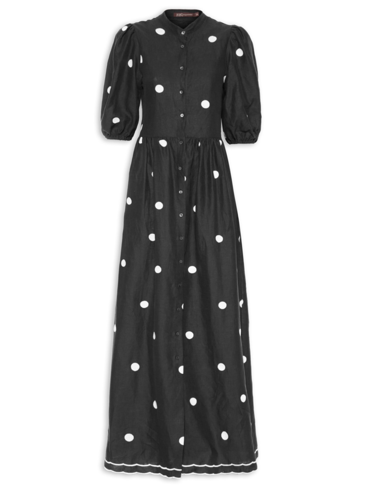 O vestido preto é confeccionado em linho sem elasticidade. A peça solta ao corpo de modelo chemise possui gola padre com logo metalizado da marca aplicado na parte posterior, mangas curtas bufantes com detalhes de franzidos nas cavas e elástico embutido nos punhos, recorte com detalhes de franzidos na altura da cintura, bolsos frontais embutidos, poá bordado em cor contrastante, comprimento longo e fechamento frontal por botões.